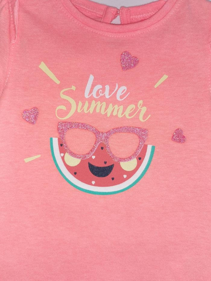 Tee-shirt 👕 "love summer" 👶 Kimadi Taille 3 Mois • Matière: 65% polyester - 35% coton • Manches courtes • Ouverture goutte d'eau💧 avec 1 bouton dans le dos • Motif pastèque 🍉 et lunettes 👓 pailletées 💰Prix boutique: 4.99€ Parfait état👌, avec étiquette🏷️, jamais porté 🟤