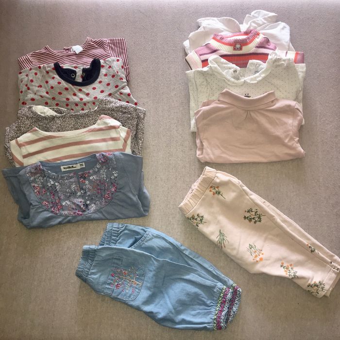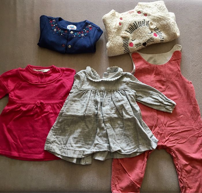 9 hauts manches longues différentes épaisseurs 1 gilet 1 pull 2 pantalons 1 salopette velours côtelé 2 robes manches longues Couleurs variées Marques variées