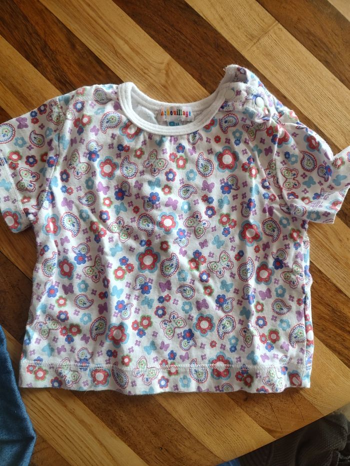 Jolie ensemble d'été pour fille. Tee-shirt motif papillon et fleur, marque barbouillage et pantalon fin C et P.