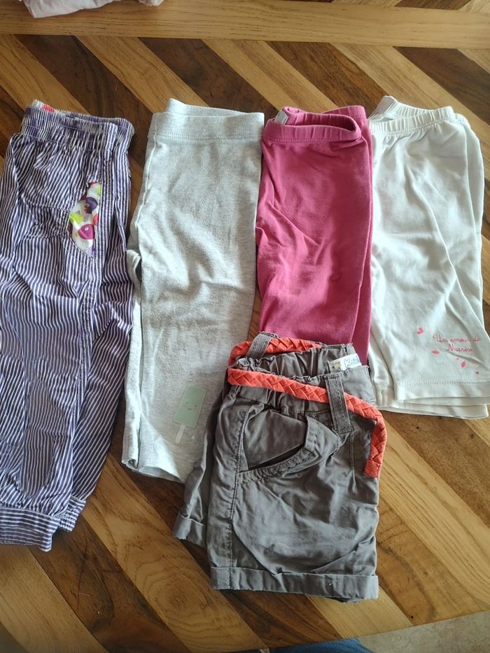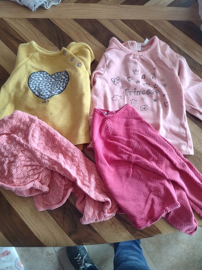 Lot comprenant - 4 bodies manches courtes - 2 bodies Marcel ( les deux violet) - 1 bodie manche longue - 3 pantalons molletonné - 3 legging (le blanc a une petite tâche dans le bas) - 1 pantalon léger - 1 short - 3 tee-shirts - 2 débardeur - 8 robes dont 1 manche longue - 2 pulls, un léger (rose) et un plus épais - 2 gilet, un court (le rose un peu plus clair) et un normal. - 1 pyjama léger Au total 33 articles, en bon état pour la plupart certains très bon état. J'offre avec un pull léger de la marque orchestra avec renard (il sera à détacher). Différentes marque, orchestra, Kiabi, tape à l'oeil, kitchoun, obaibi etc...