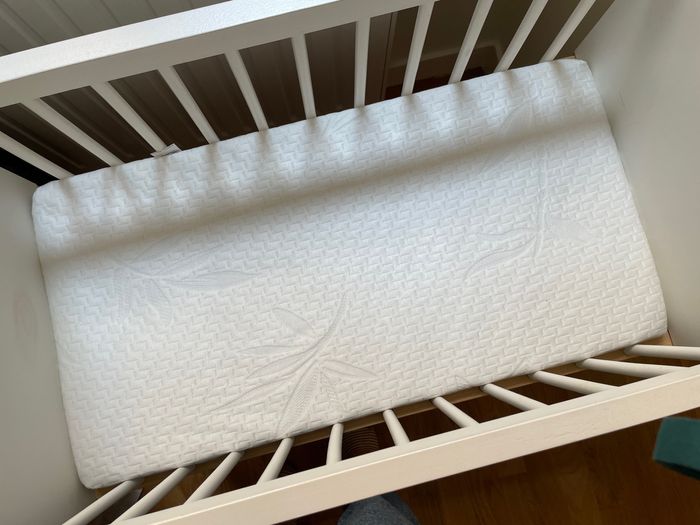Berceau à barreaux LIGNE CONFETTI - blanc/bois prix neuf : 229€ - très bon état, à peu servi. Longueur 82 x P 45 (57 avec pied sur bascules) x H 94 cm Hauteur couchage : 52 cm env; Bascules amovibles. Sommier inclus Matelas de berceau en bambou 40x80cm - Pioupiou et merveilles - viscose de bambou - anti bactérien - made in France - acheté en octobre 2022 à 36,15€ - très peu servi - très bon état Lot de 3 draps housse 40x80cm - 2 blancs & 1 rose À récupérer à Lyon