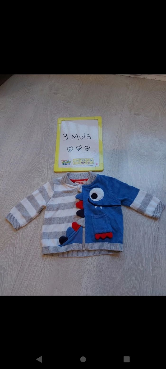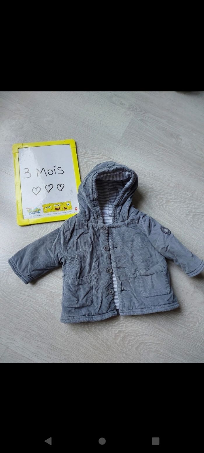 Manteau, gilet chaud et un sweat. Les 3 sont en taille 3 mois et en très bon état.