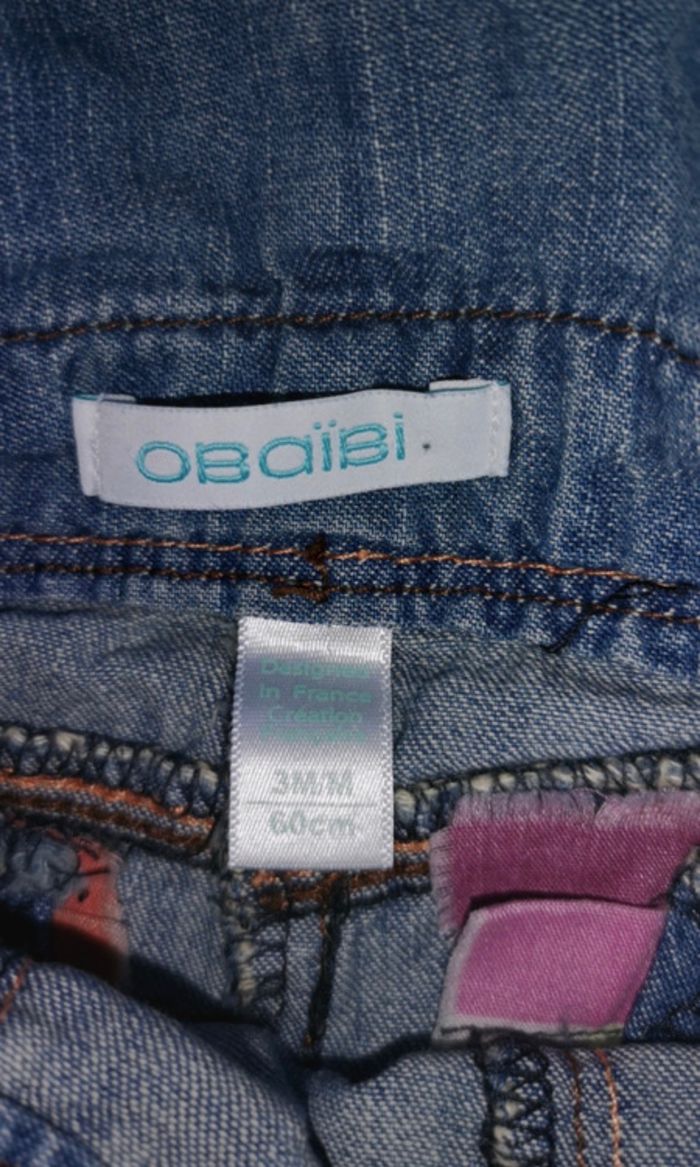 Mignonne petite salopette-short en jean achetée chez Obaïbi , taille 3 mois, très peu portée, elle est en excellent état !