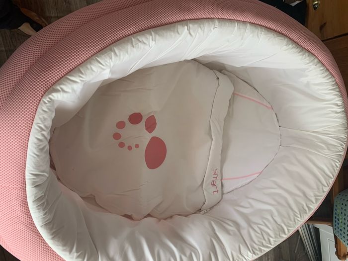 Berceau de la marque micuna super pour les premiers mois, support sur roulettes pratique pour le déplacer. La literie est neuve il y a juste une petite tâche de rouille au niveau de l anneau en fer ça ne se voit pas c est le fond du berceau . Le support est de couleur blanche lui a servi pour un bébé