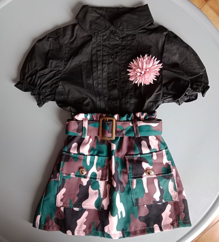 Ensemble neuf jupe camouflage, chemisier élégant fleur poitrine (2/3ans)