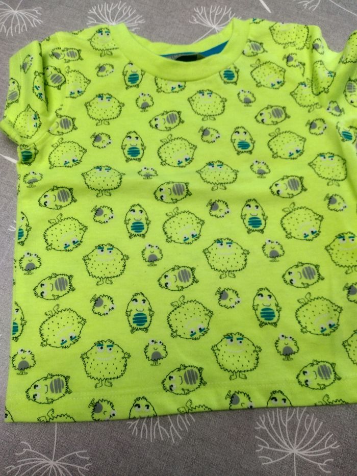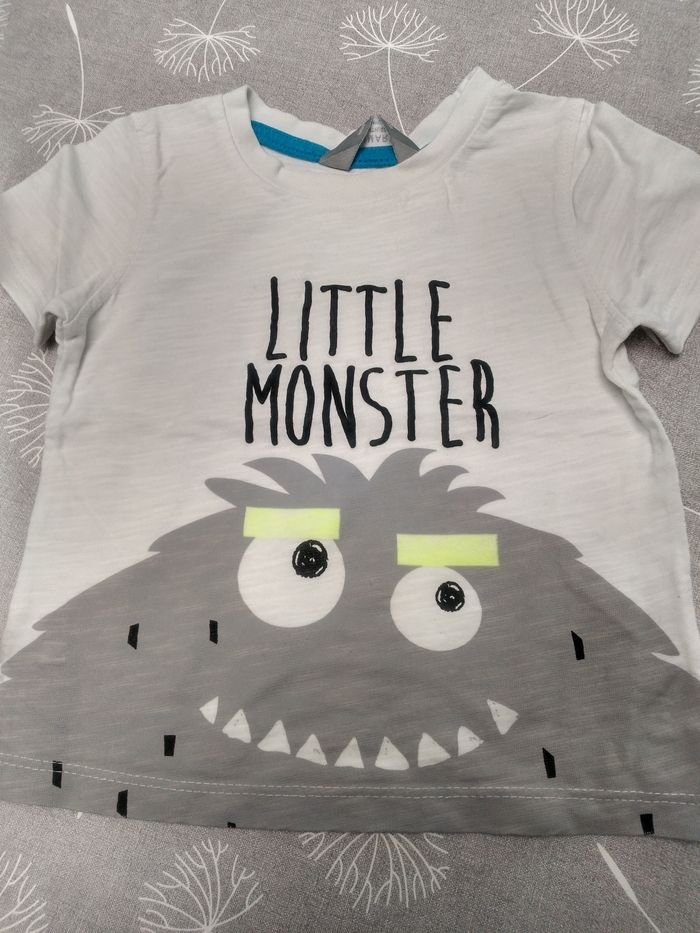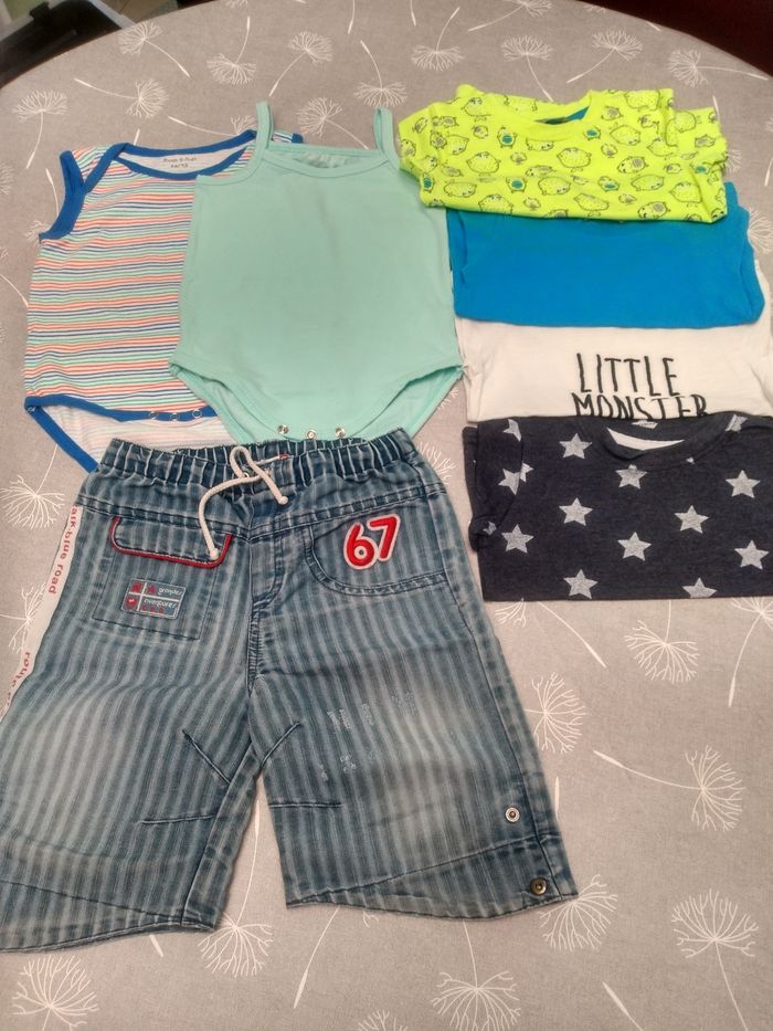 Lot pour l'été, garçon en taille 86. Composé de : 1 jeans 3/4 Orchestra 1 body fines bretelles Zeeman 1 body sans manches ligné Zeeman 1 t-shirt étoiles Primark 1 t-shirt "Little Monster" Primark 1 t-shirt bleu Primark 1 t-shirt jaune fluo Primark Très bon état Bac 16