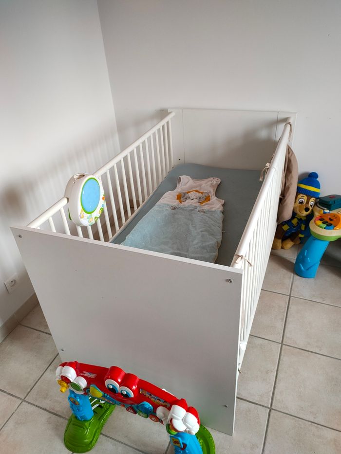 Lit bébé en bois blanc. Plusieurs niveaux, quelques barreaux peuvent s'enlever pour la transition de bébé.