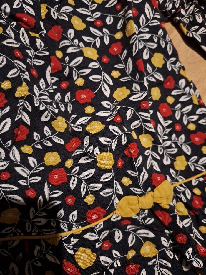 Bleu marine avec motifs blanc, rouge et jaune. Peu portée, très bon état