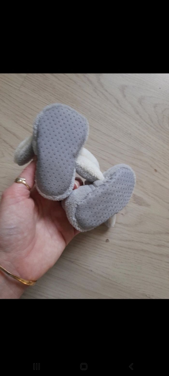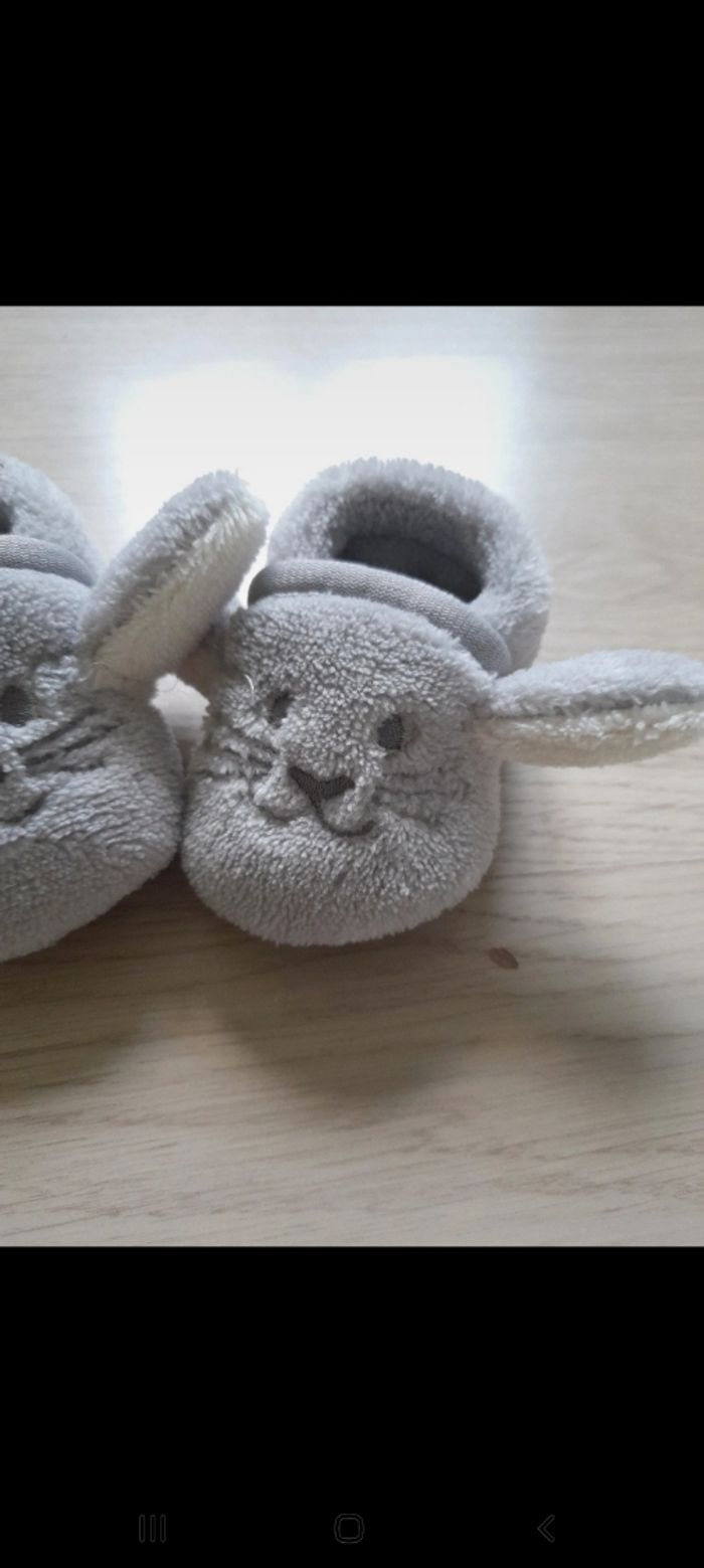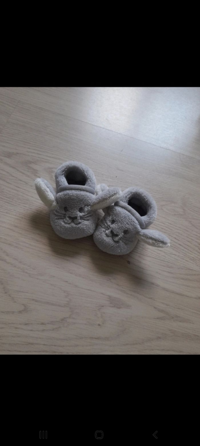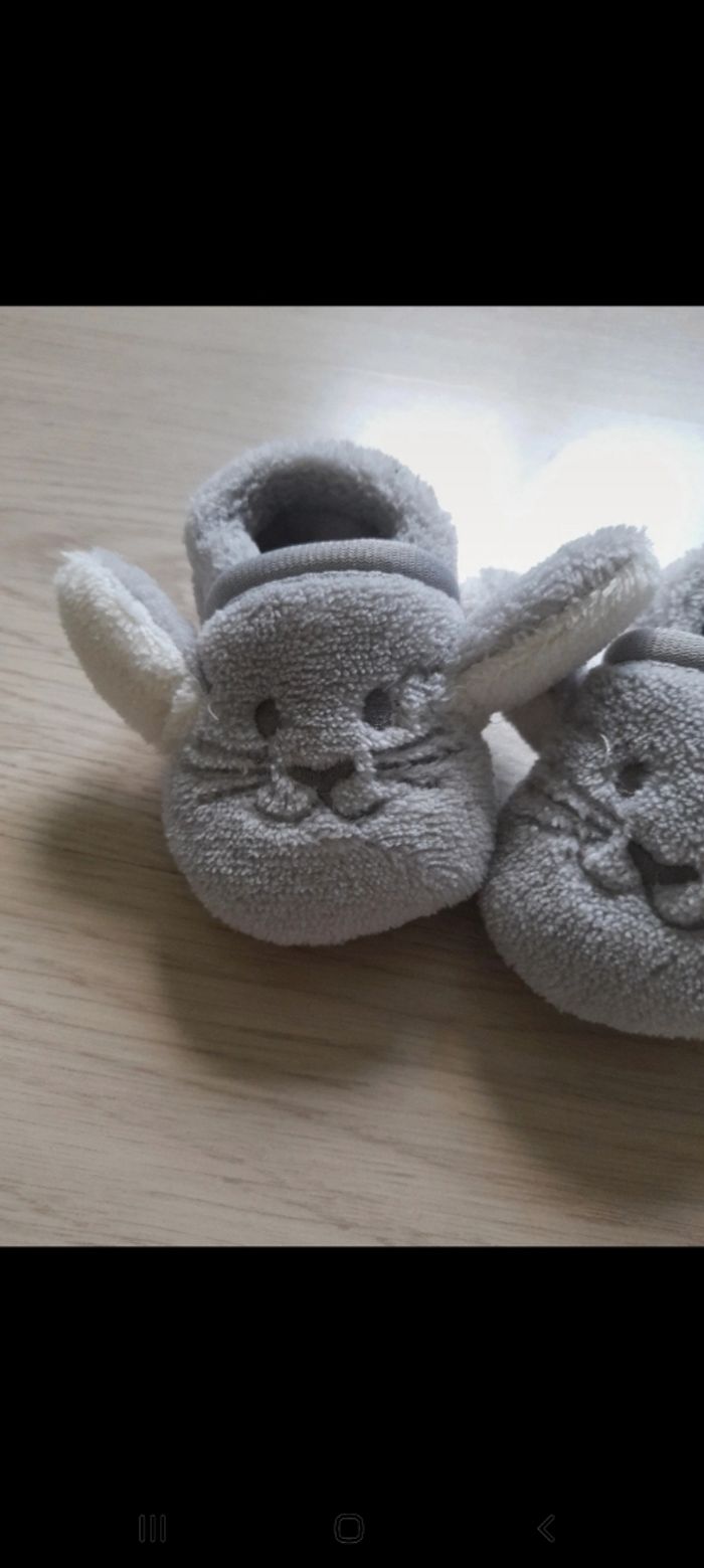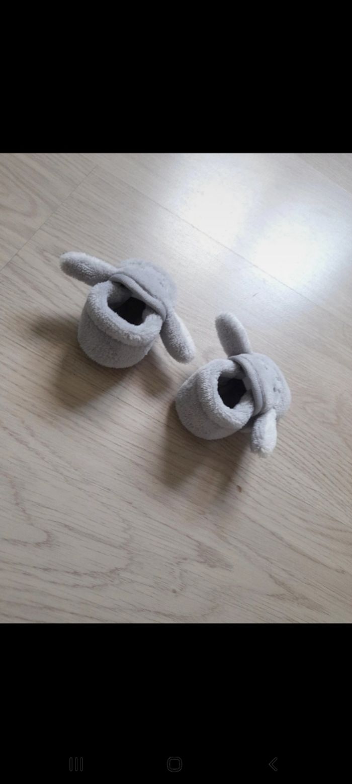 Petits chaussons très sympathique avec élastique à l'intérieur pour tenir aux pieds couleur gris et blanc longueur 10cm Taille 0-3 mois