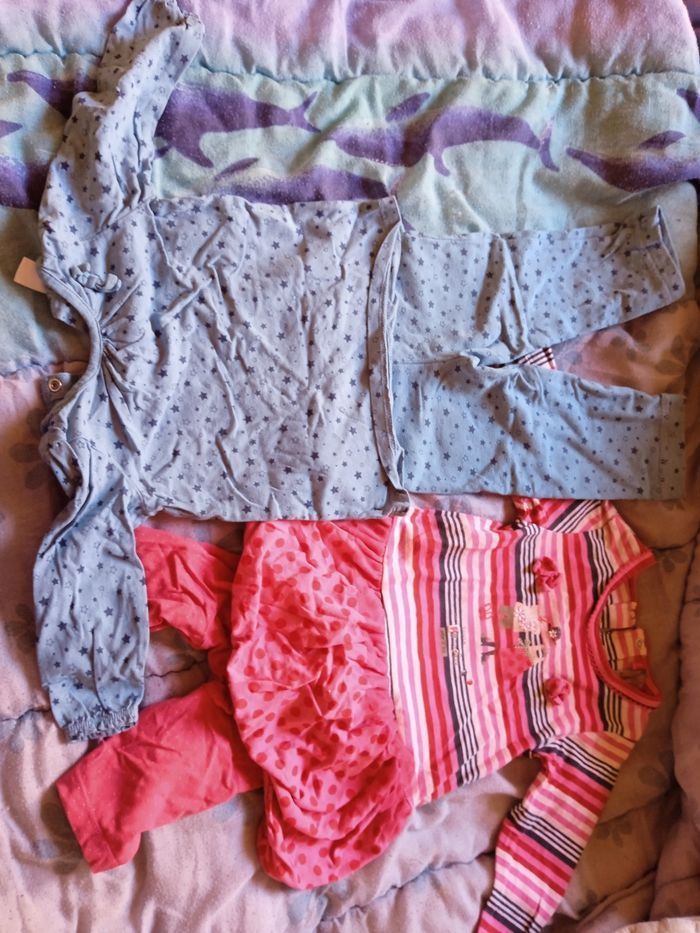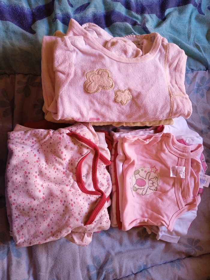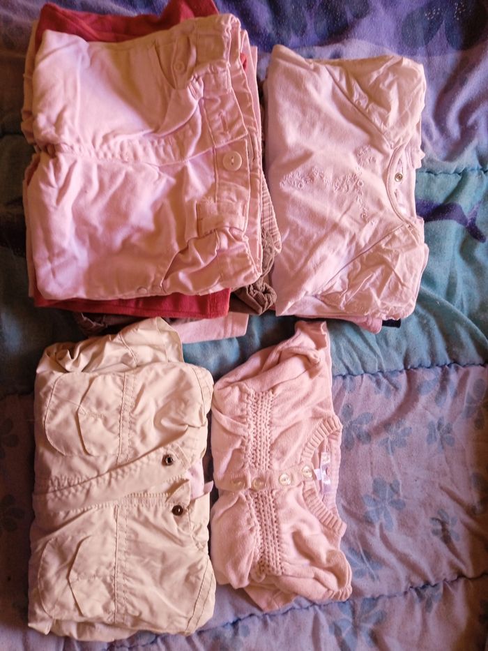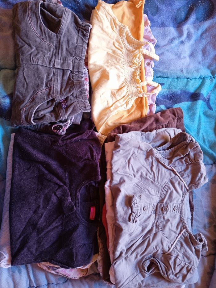 Il y a 5 pulls, 1 gilet, 1 petite veste, 2 short, 3 robes type hiver, 4 types été, 9 pantalons, 3 t-shirt, 4 pyjama, 5 body manches longues, 5 body manches courtes dont 2 neuf et 2 ensembles type hiver. Ils ont déjà été porté, ils y a quelques tâches sur certains vêtements et sur quelques-uns on peut voir apparaître quelques traces d'usure.