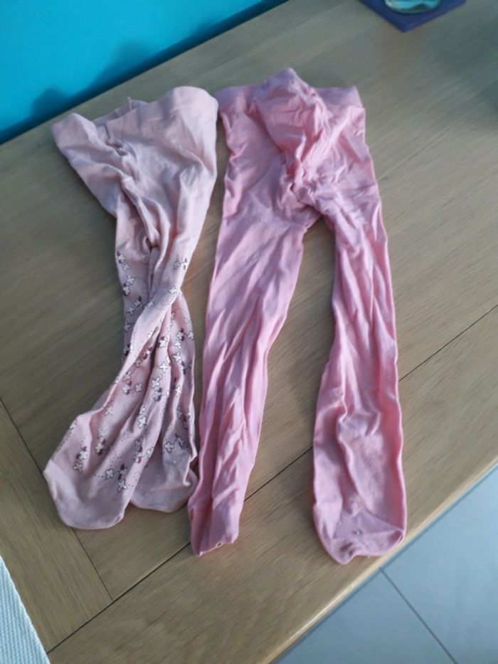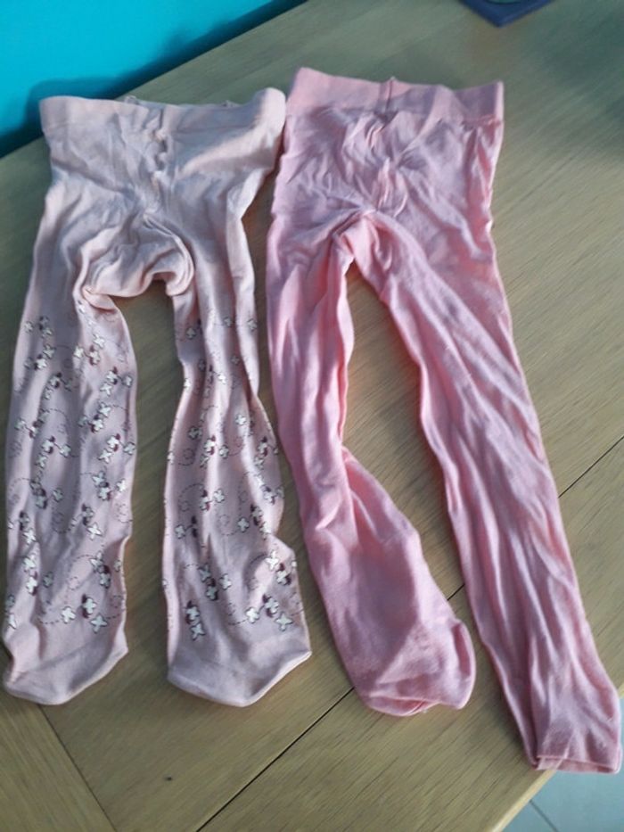 lots de 2 collants fins en bon état un uni rose, un avec motifs ont été portés mais pas de trous taille 18 mois ( mais pas d'étiquette)