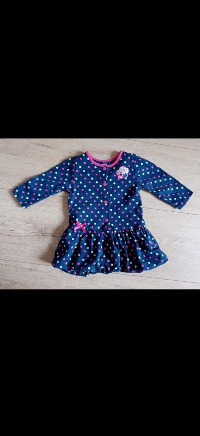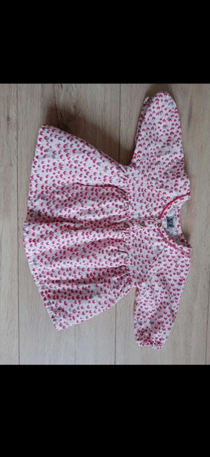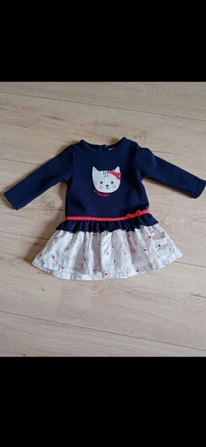 Lots de 3 robes fille 3 mois La bleue à pois : terre de marrains Motif cœurs roses : TAO La bleue chat : orchestra