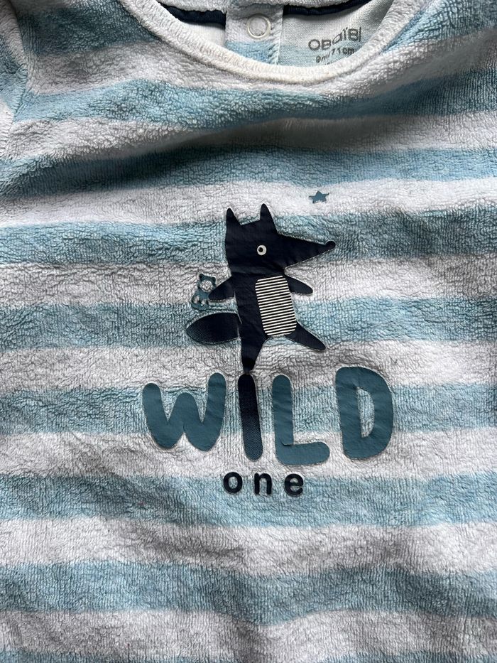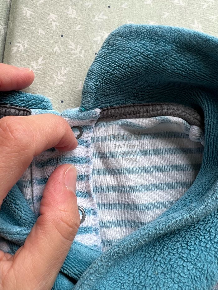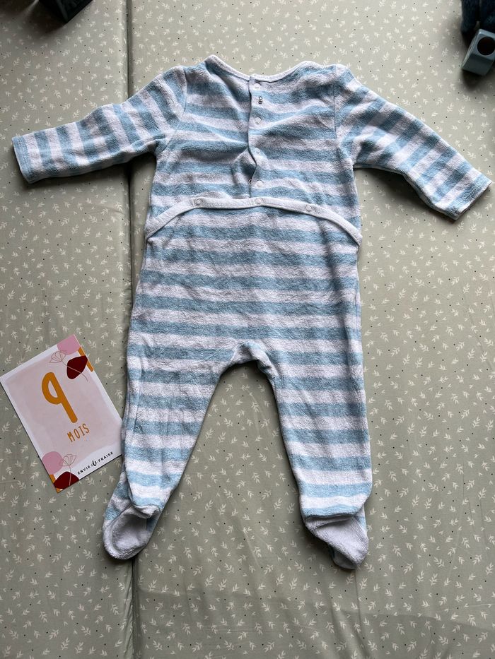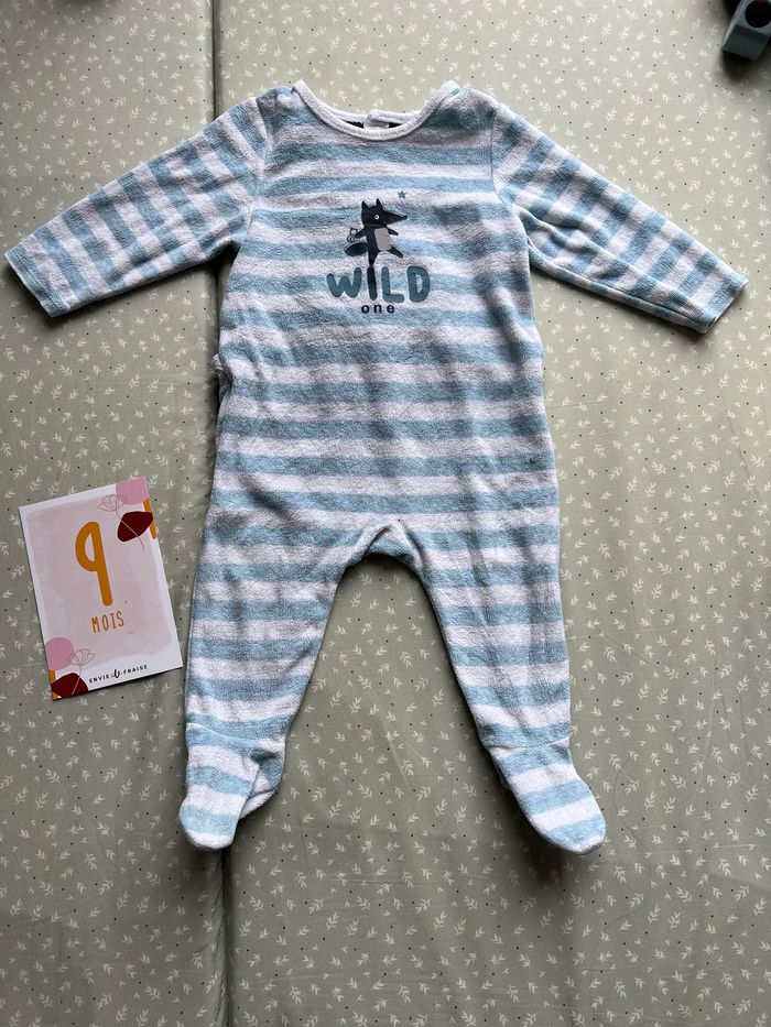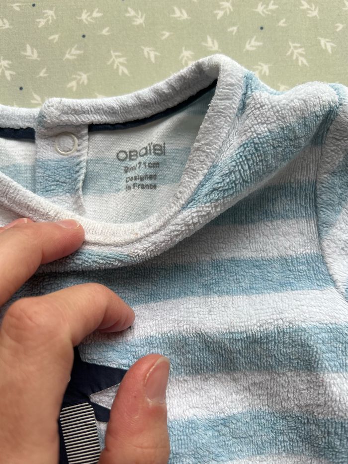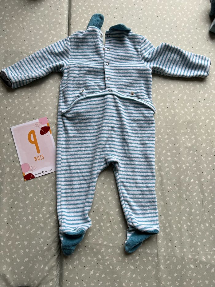 Tissu un peu raide sur les 2 pyjamas bleu ,mais je n’ai pas de sèche linge pr les assouplir Le pyjama lapin est offer il n’a pas de taille mais sûrement 6-9 mois