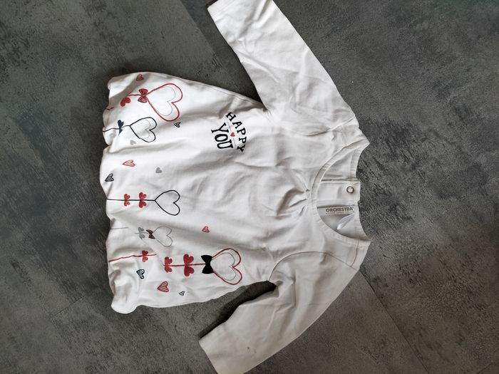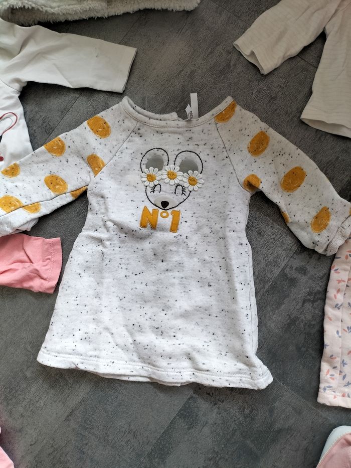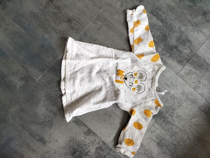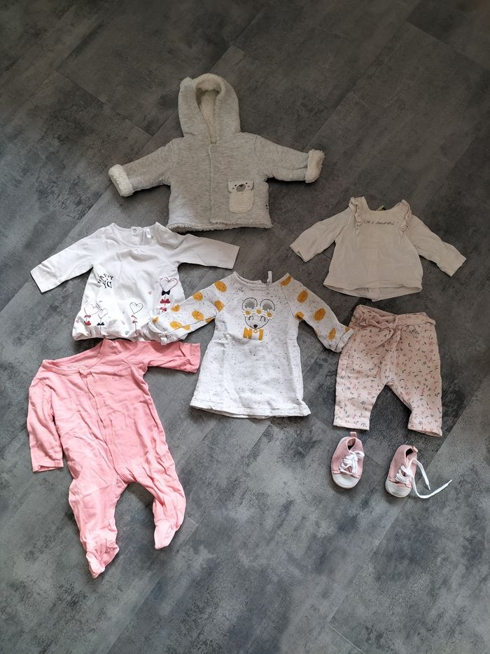 A vendre lot de 7 articles: - 1 veste molletonnée in extenso taille 3 mois 62 cm - 1 pyjama fin in extenso - 1 robe orchestra 60 cm - 1 T-shirt blouse orchestra 60 cm - 1 T-shirt Tape à l'oeil 59 cm - 1 pantalon Tape à l'oeil ⚠️ taille 1 mois 53 cm - 1 paire de chaussures Lot complet+1 combi short absorba 59 cm offerte (abîmé au niveau d'une pression).