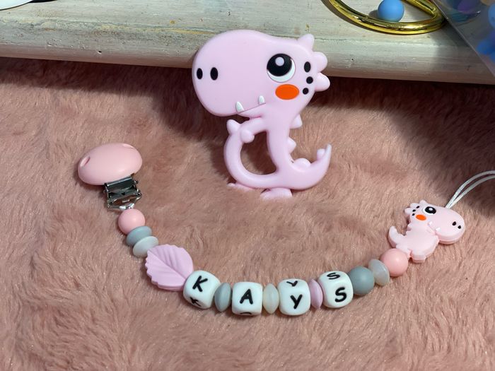 Attache tétine dinosaure à personnalisée Plusieurs couleurs disponible A modifier selon vos envie Possibilité d’avoir l’ensemble attache tétine et anneau de dentition ( qui sera personnalisée aussi ) pour 25€