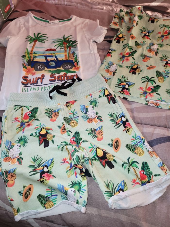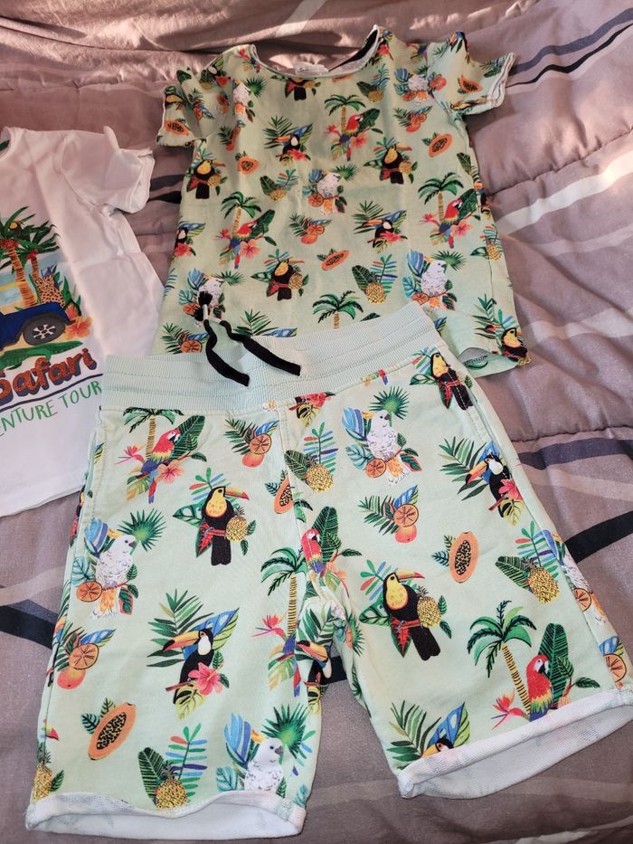 ensemble 3 pièces h&m le short et t-shirt vert proche du neuf ,le t-shirt blanc 1 petit accros sinon bon état
