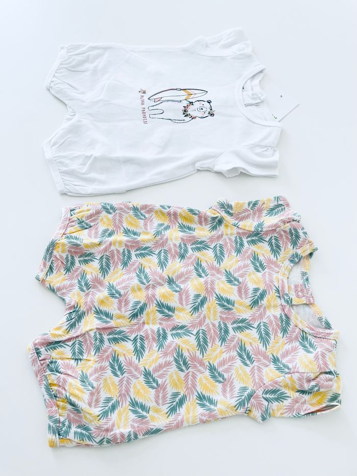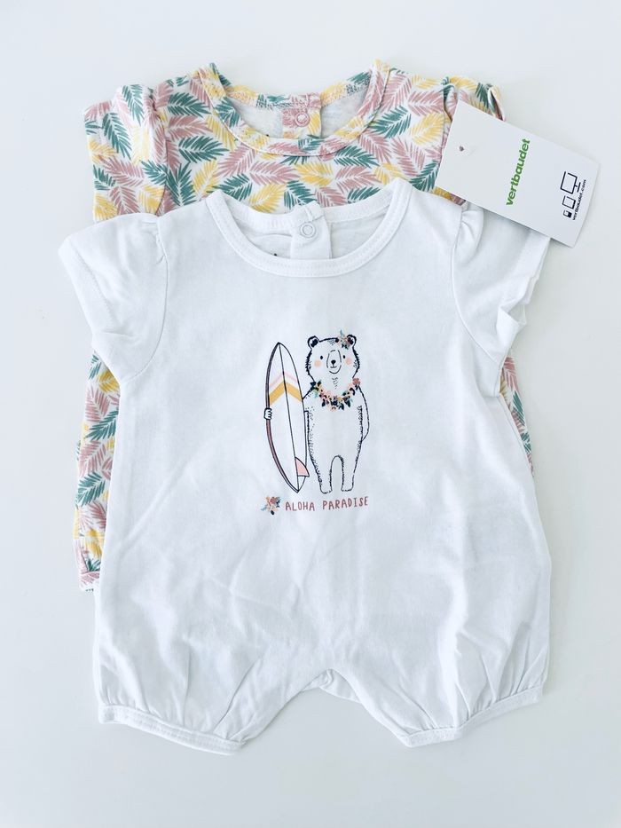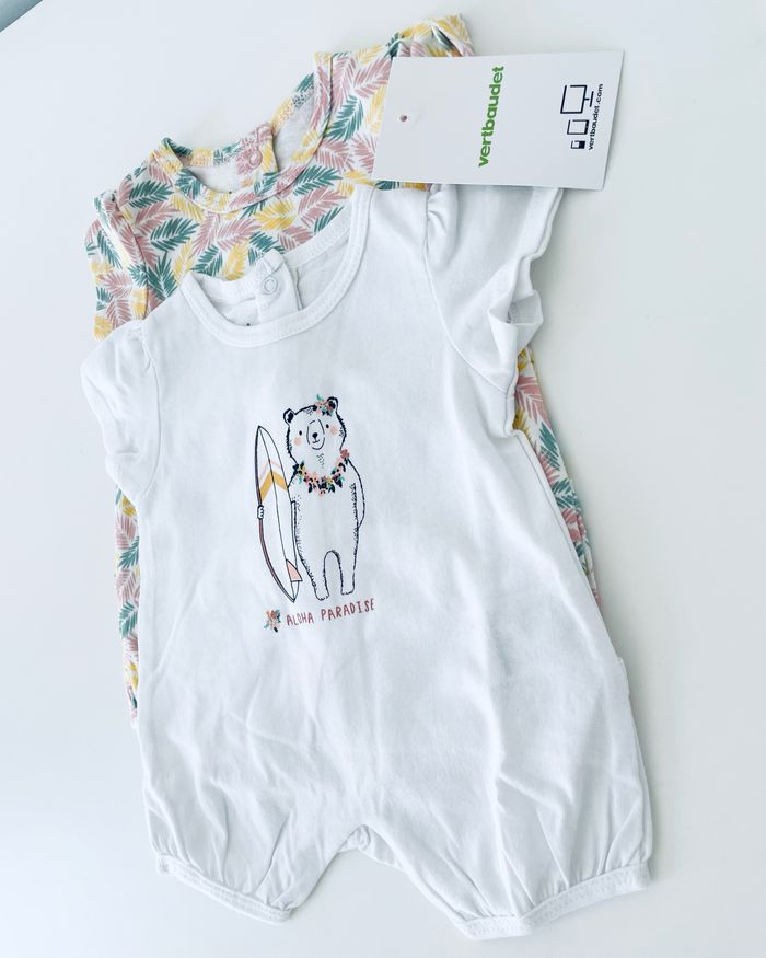 Adorable lot de 2 combishort Vertbaudet, taille naissance. Très pratique et surtout très confortable pour bébé avec les jours de chaleur. Articles neufs avec étiquette.