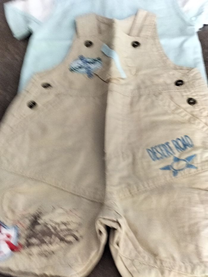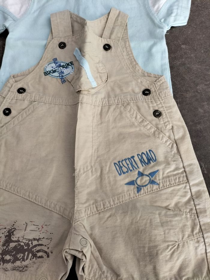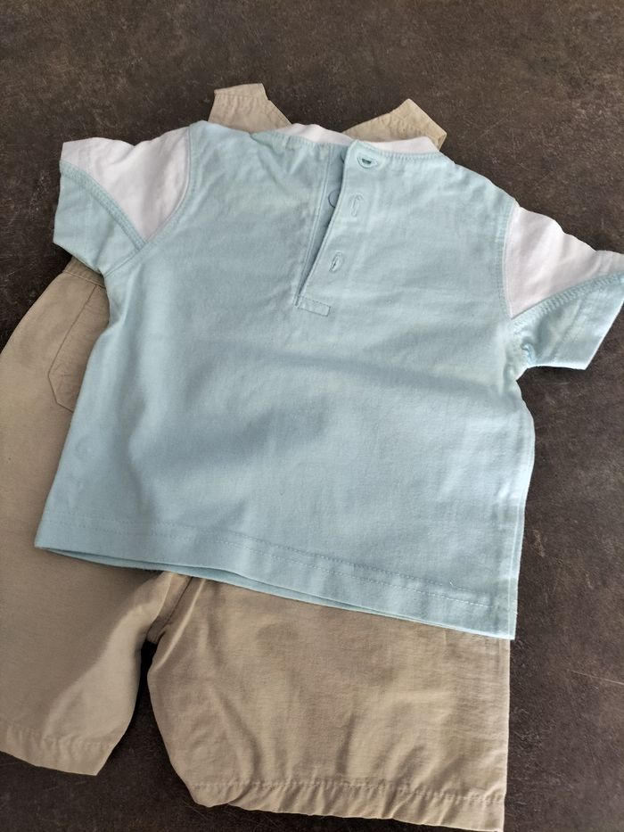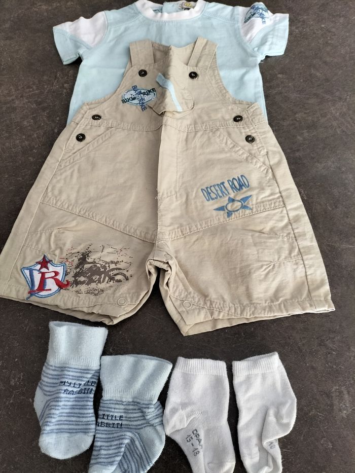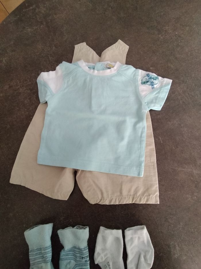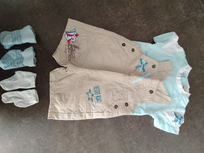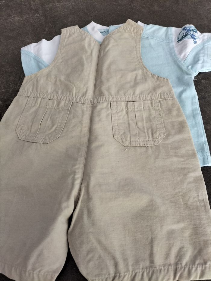 Loe en 3 mois garçon comprenant Salopette beige, t.shirt bleu ciel fermeture par 3 boutons dans le dos 1 paire de chaussettes 15/18 bleue ciel 1 paire de chaussettes en 13/14 blanche En très bon état, comme neuf