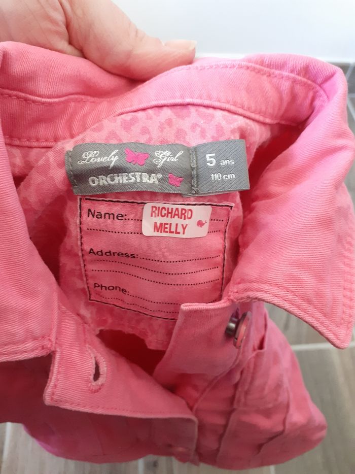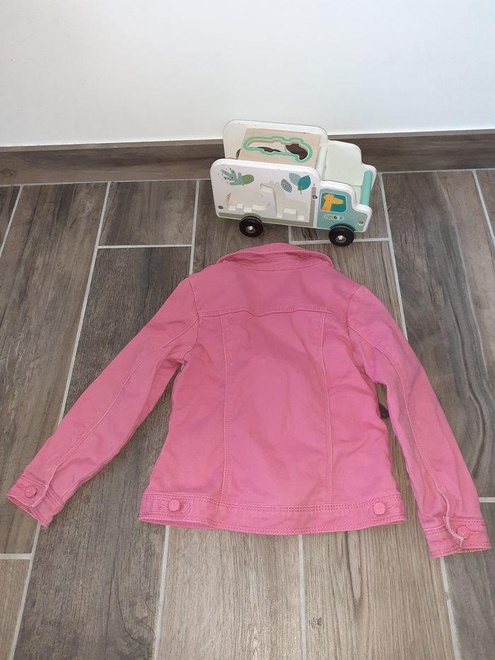 Veste en jeans rose taille 5 ans, en bon état, beaucoup porté , légèrement manque un peu de peinture sur les boutons.