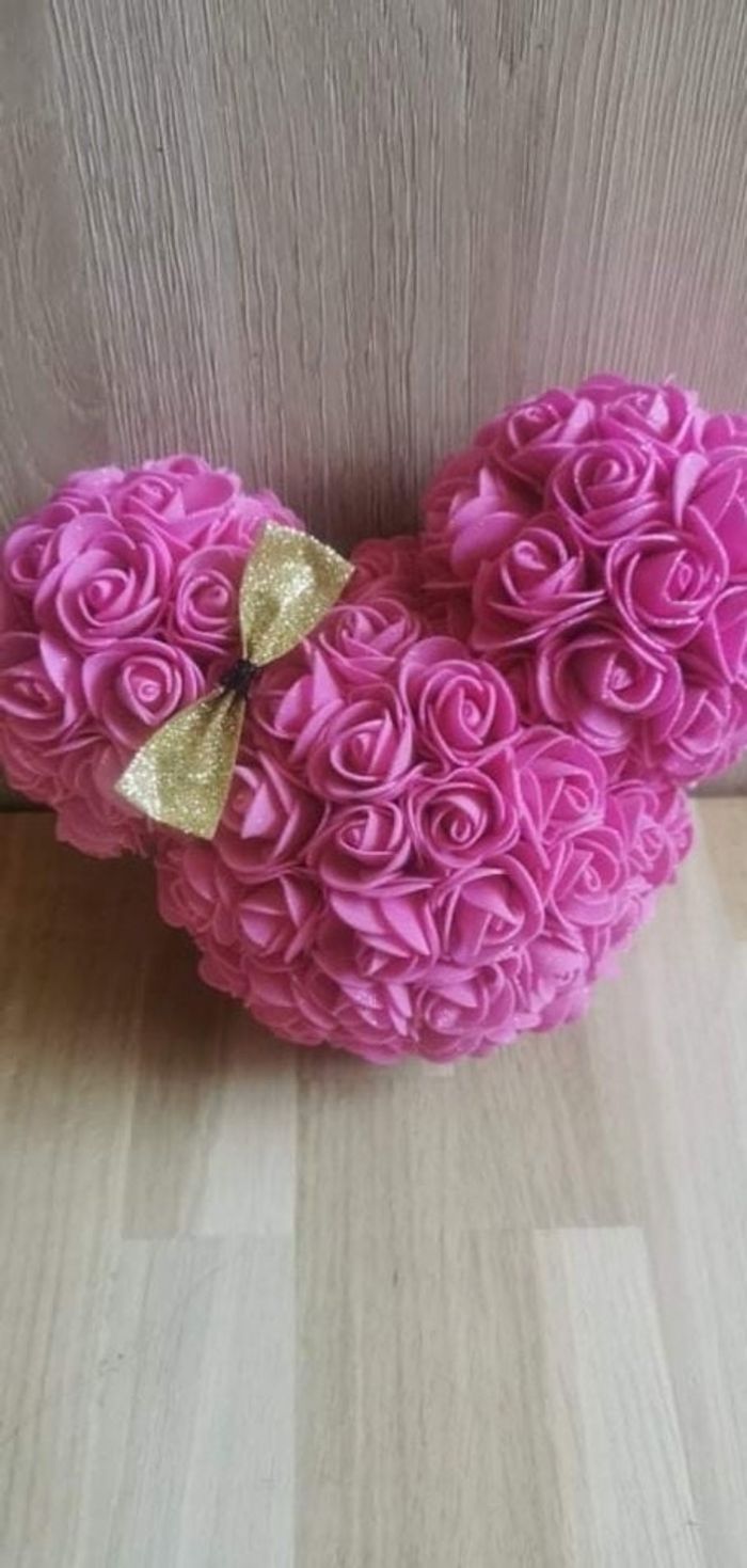 Tête de Minnie taille L (17x18cm) en fleurs artificielles (mousse) roses avec nœud doré. Sur la photo il y a l'option paillettes (paillettes sur les fleurs) mais possibilité d'enlever cette option. Vendu avec un cercle pour poser. D'autres couleurs sont disponibles.