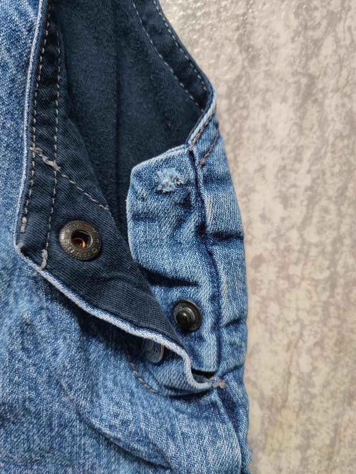 Il y a une attache de bretelle qui est cassée et il manque une pression sur le côté (voir photo) sinon salopette épaisse en très bon état