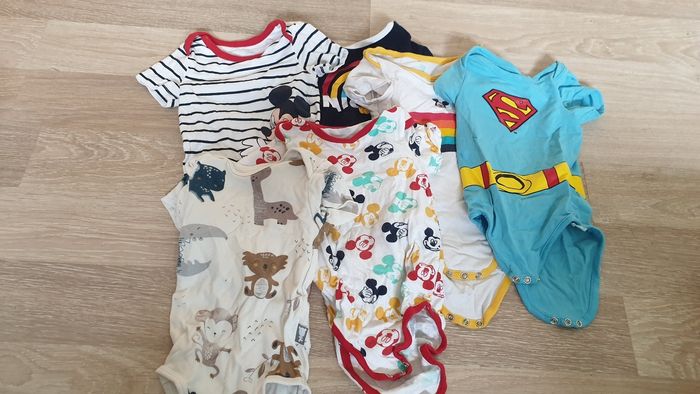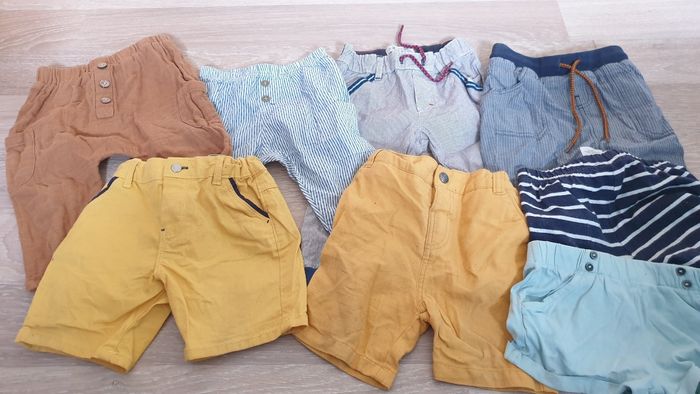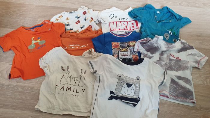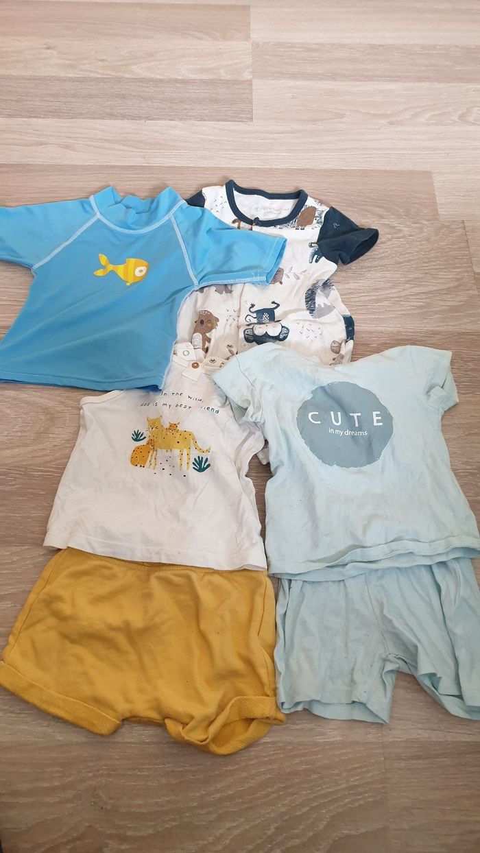 4 pantalons légers 4 shorts 9 tee-shirts manches courtes 6 bodys manches courtes 2 pyjama 1 tee-shirt anti uv 12/18 mois Toutes marques : kiabi, orchestra, Marvel, Grain de blé, Liberto...