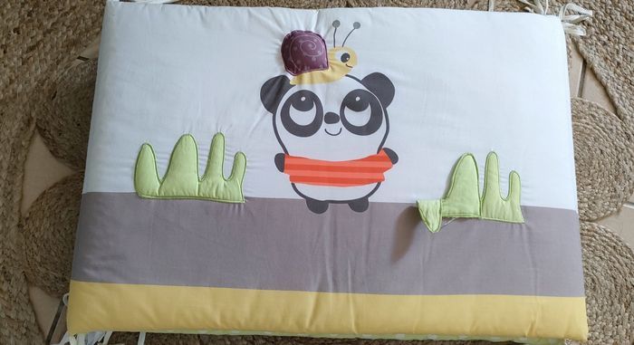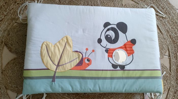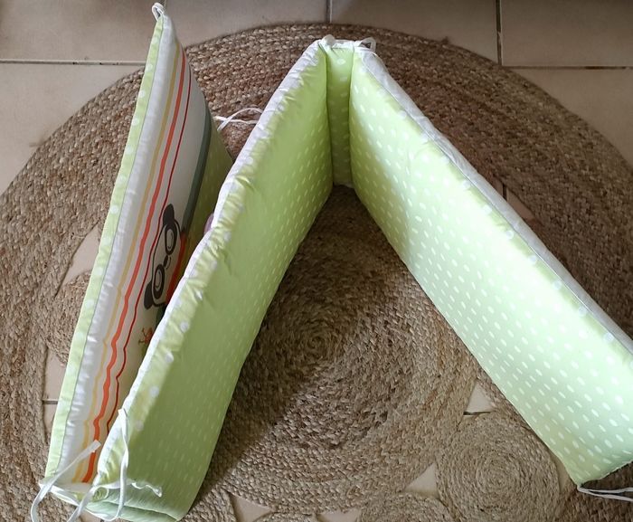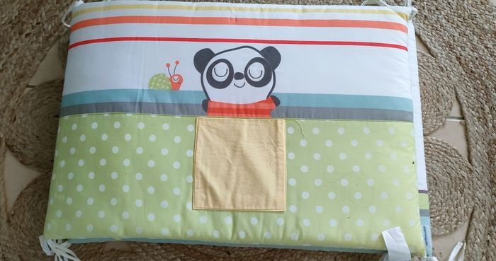 Tour de berceau avec des petits accessoires sonores, pochette et petit miroir d'un côté. De l'autre côté tout simple vert et petits points blancs!