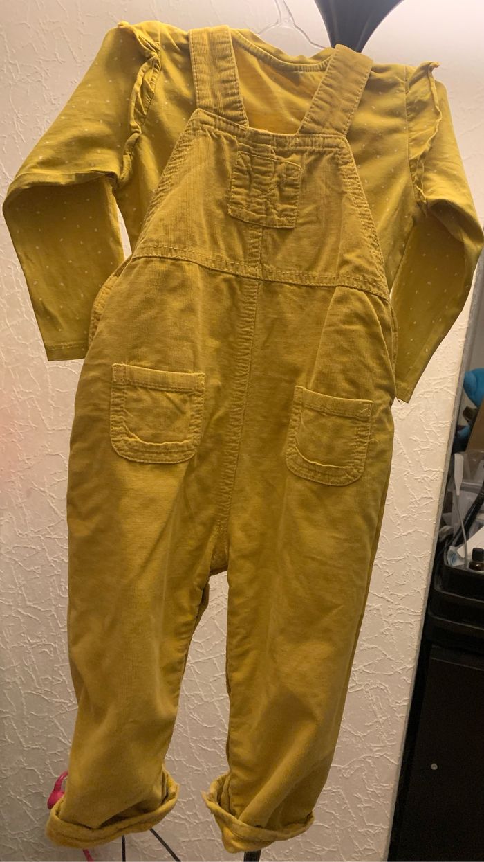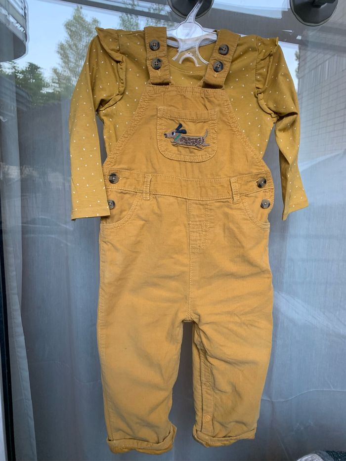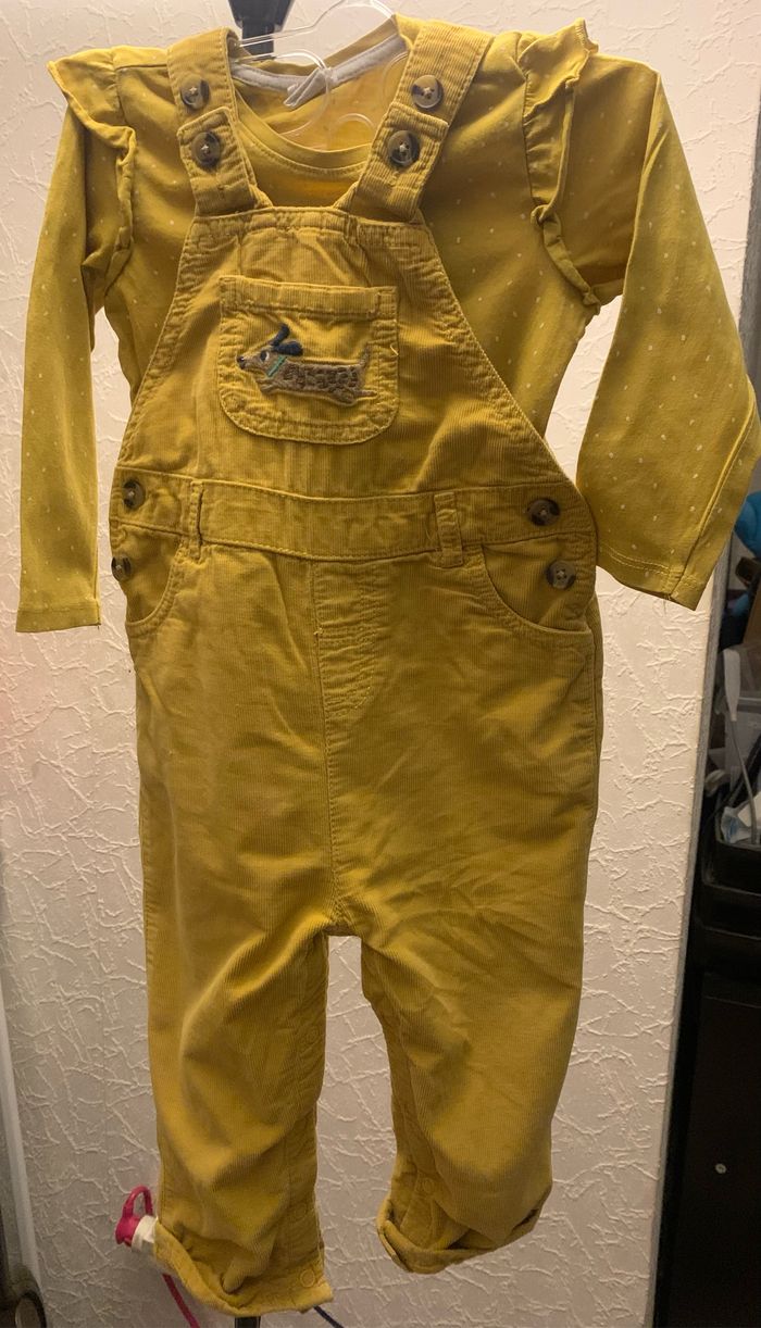 Ensemble salopette + haut (100% coton) Micro tache stylo (voir dernière photo) Couleur : moutarde Taille haut : 9/12 mois (80cm) : H&M Taille bas : 12/18 mois (80/86cm) : John Lewis