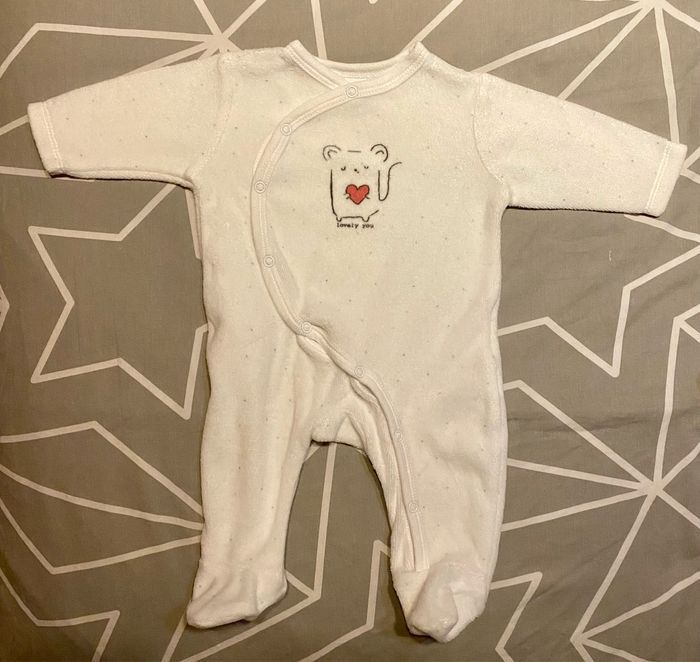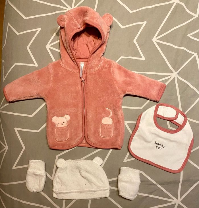 Vends lot 2 bodies + 1 pyjama = déjà portés mais en très bon état 1 veste zipée à capuche + 1 bonnet + 1 paire de gants + 1 bavoir = jamais utilisés Taille 1 mois Marque TEX en excellent état