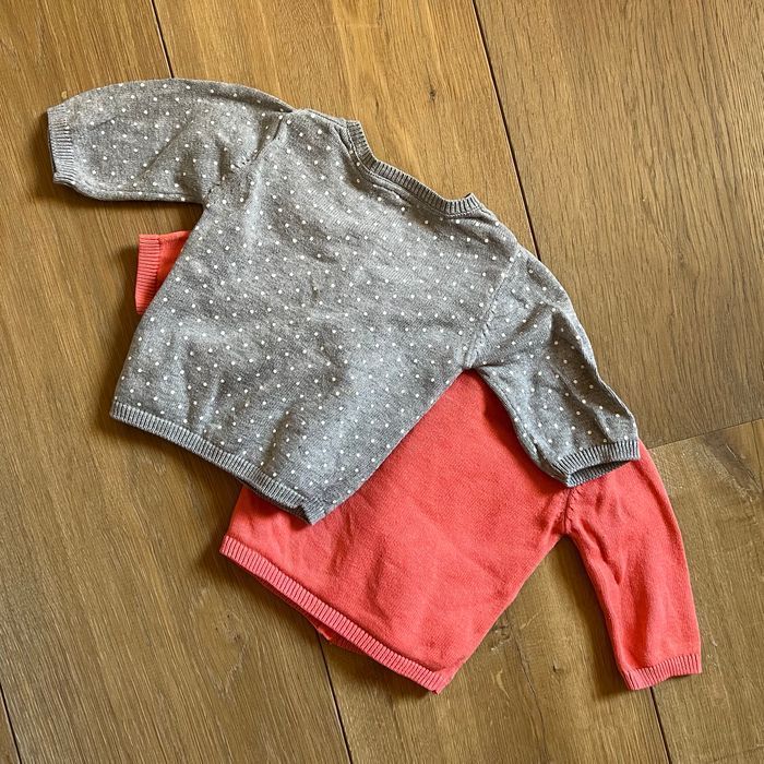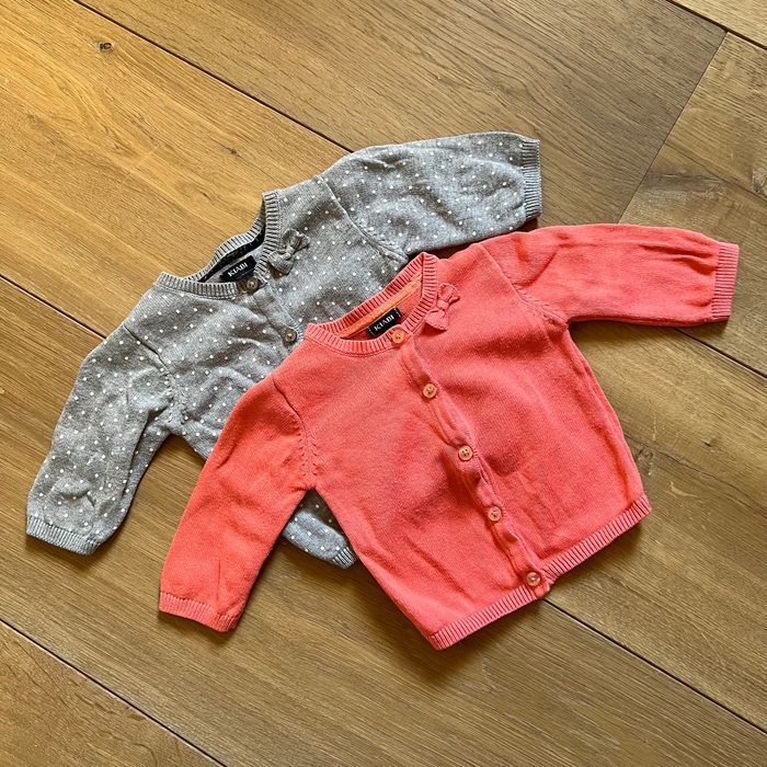 Lot de deux gilets en coton Kiabi. Gris à pois blanc et corail avec petit noeud. En très bon état, peu portés. Taille 1 mois. Parfait pour la maternité. Réductions activées sur les lots, n’hésitez pas à faire un tour dans mon dressing.