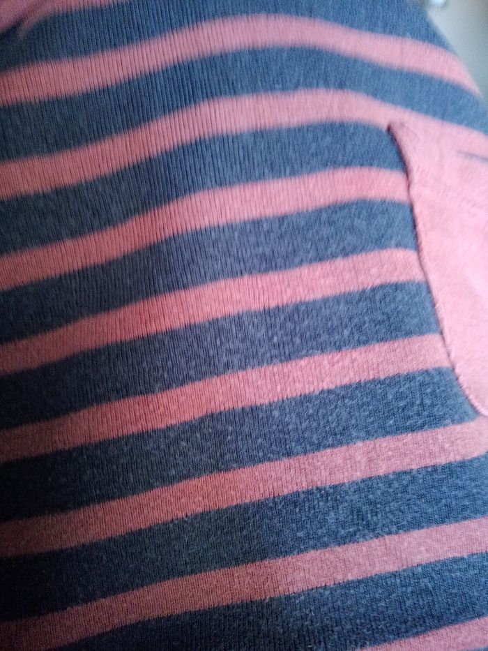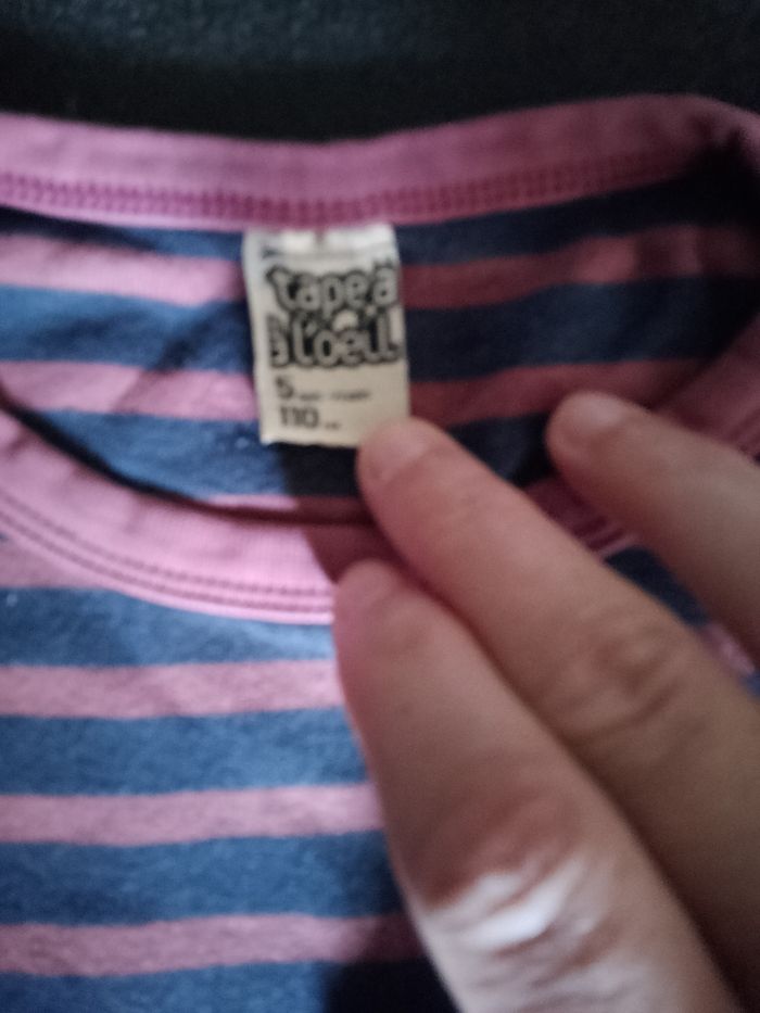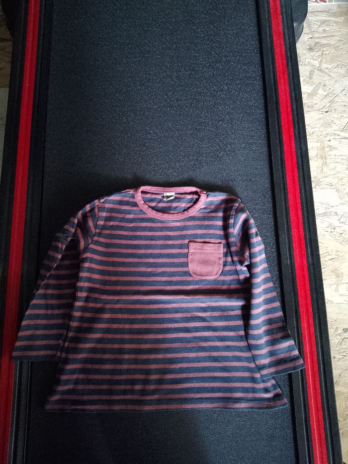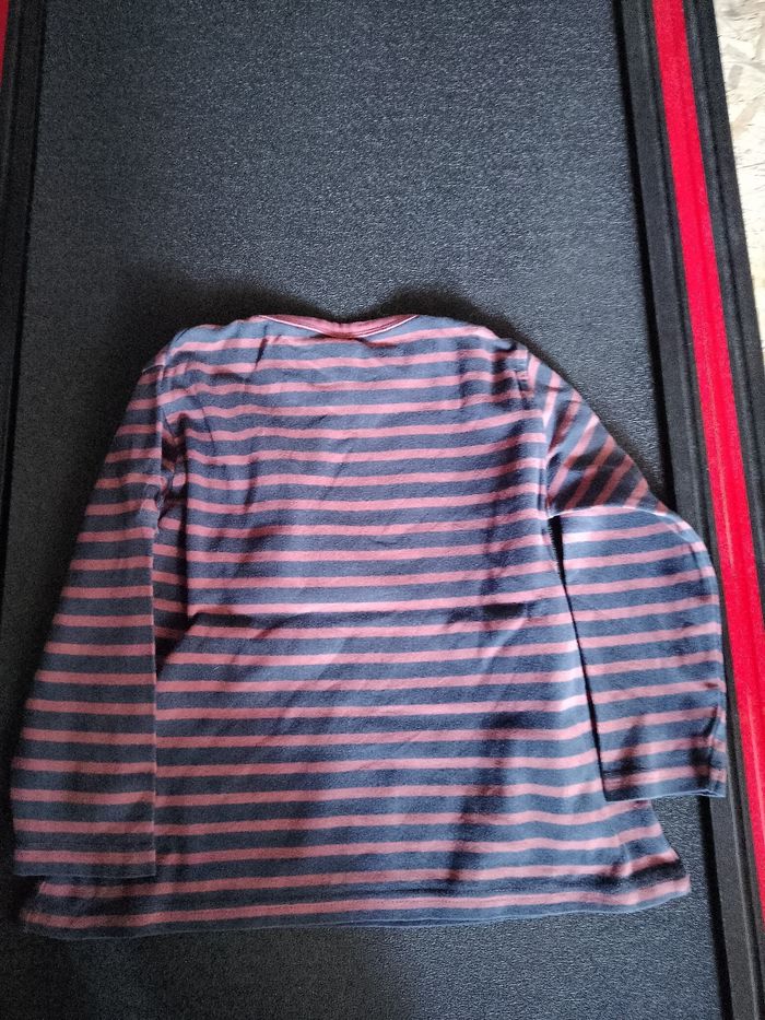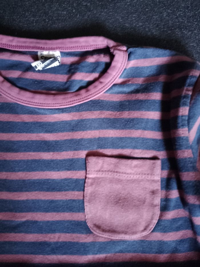 Rayé bleu marine, bordeaux. Col rond. Une pochette au niveau de la poitrine. Marque Tape à l'oeil. Taille 5 ans/110cm. Étiquette composition coupée car elle gênait. Les manches peuvent se remonter et être maintenu par un bouton.
