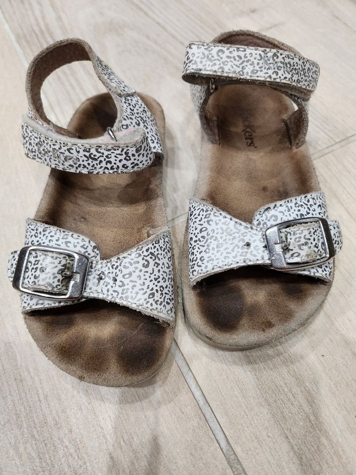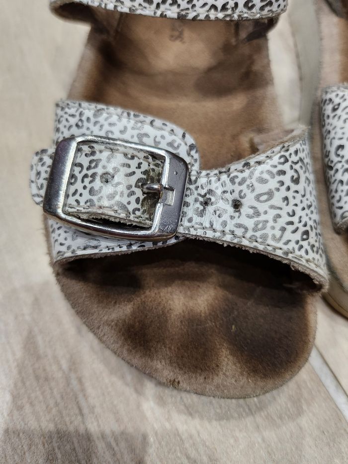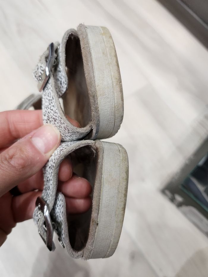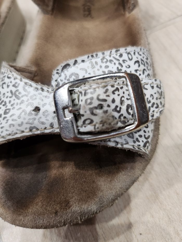 Taille 24 bonne état général semelle ergonomique facile à enfiler. Coloris blanc et gris argenté. Un peu erafle au niveau de la boucles voir photo.