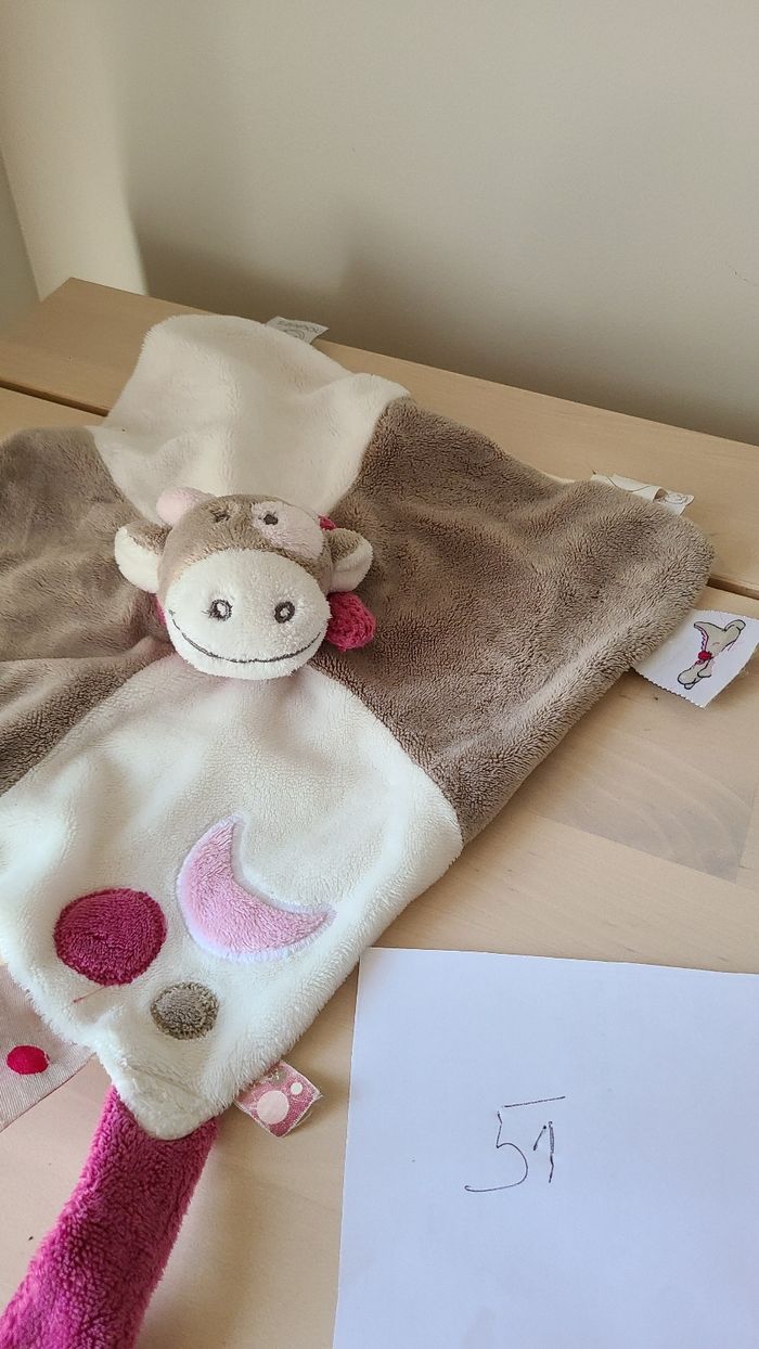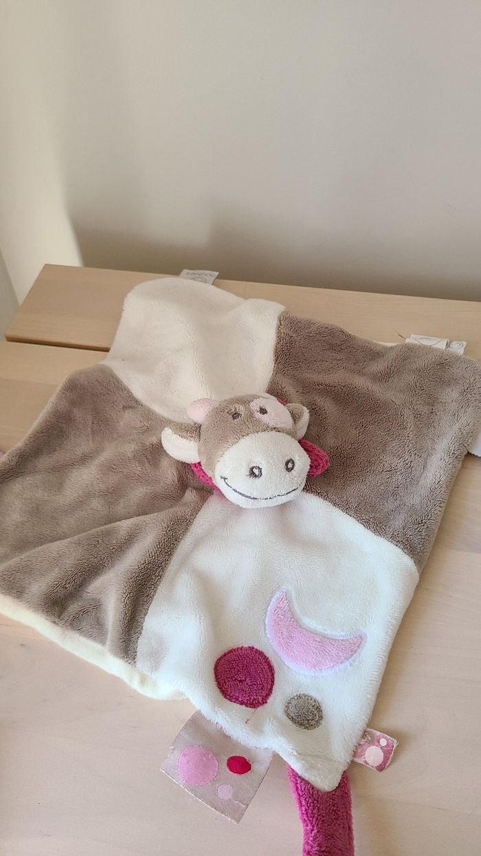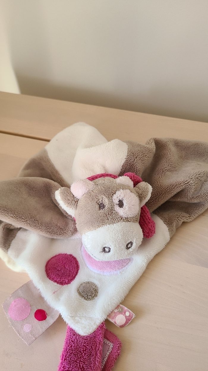 Noukie's Doudou plat tissu vache gris blanc rose lune Victoria et lucie