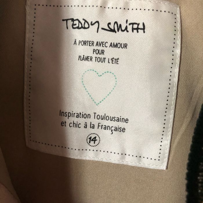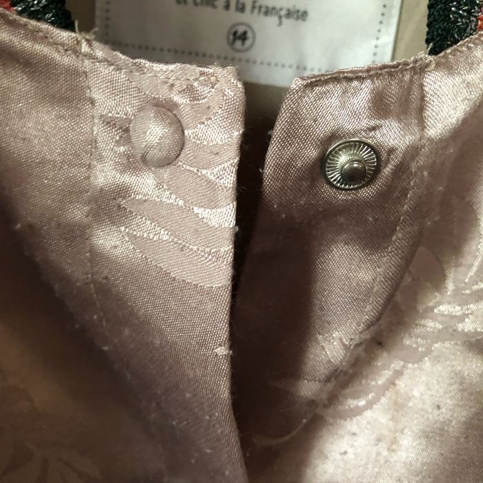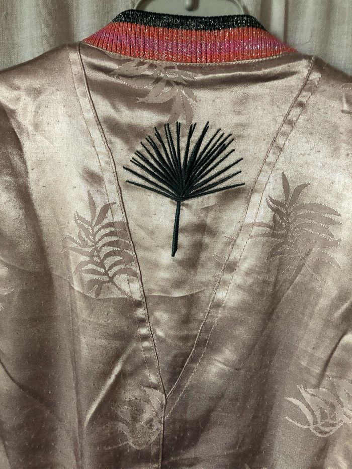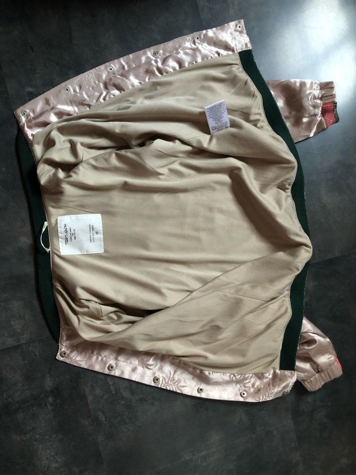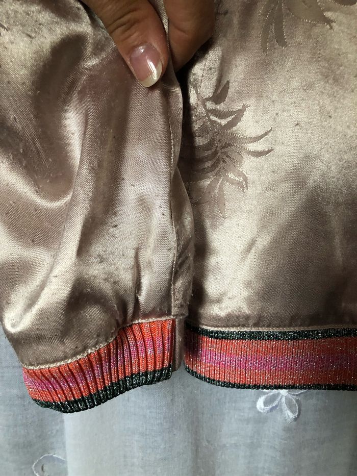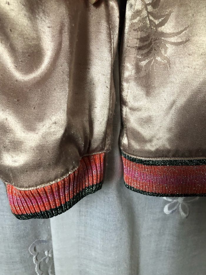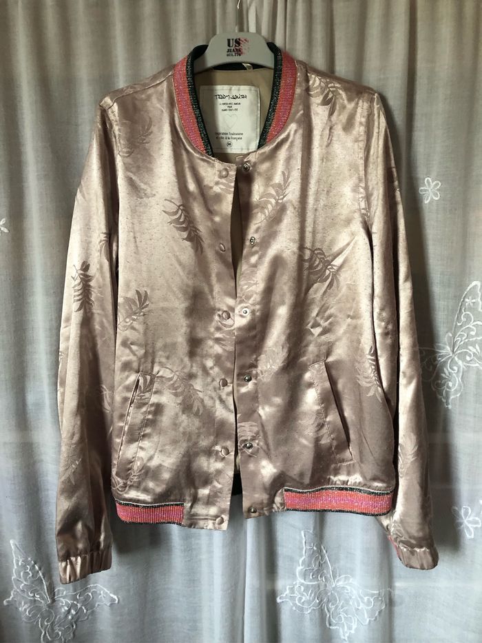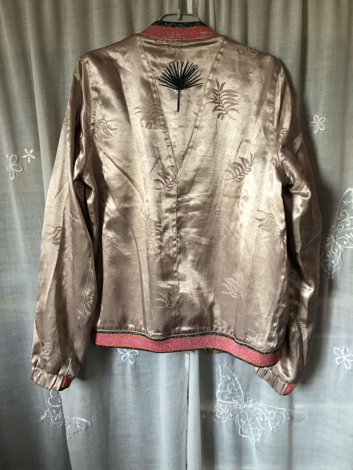Blouson bombers satin beige ( bouloché) feuillage et joli bord côte rayé vert orange rose pailleté Fermeture par pressions 2 poches Taille 14 ans Teddy Smith