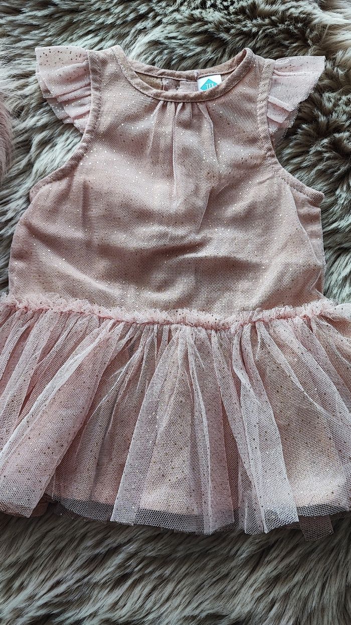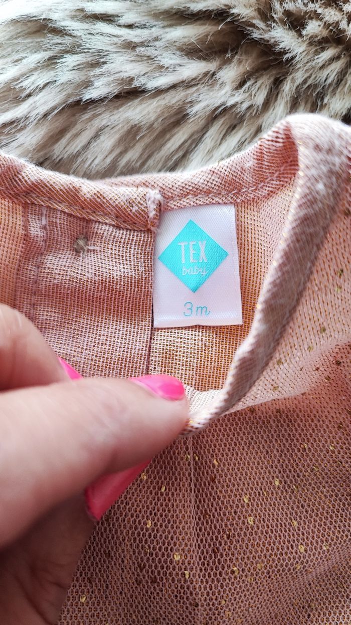 Robe rose poudré en tulle avec des paillettes dorées. Boutons dans le dos. 100% polyester De la marque tex En taille 3 mois En très bon état / maison non fumeur #laetitia33700filletroismois