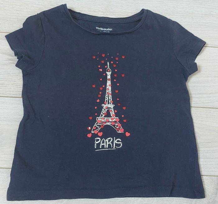 Tee shirt manches courtes avec comme motif la tour eiffel et des sequins rouges en forme de cœur.