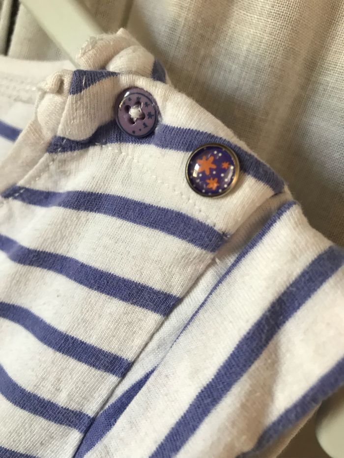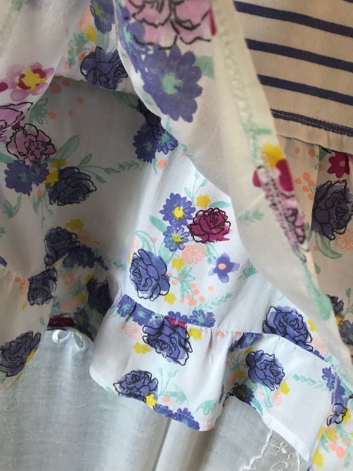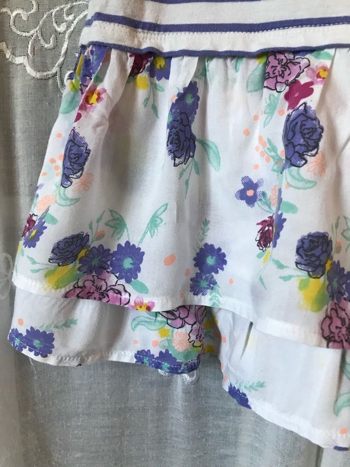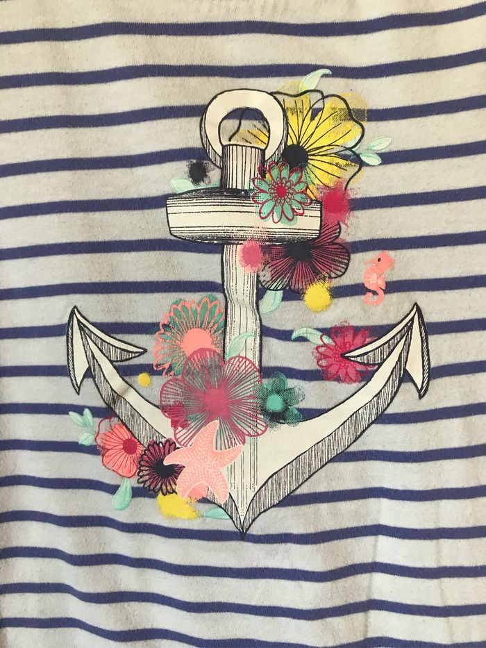 Robe marinière blanc rayé bleu jeans sérigraphie devant ancre ⚓️et fleurs multicolores Hippocampe corail Pression Etoile de mer sur l’épaule 2 volants blanc fleuris pour la jupe en viscose Taille 8 ans 126-131 cm Kiabi