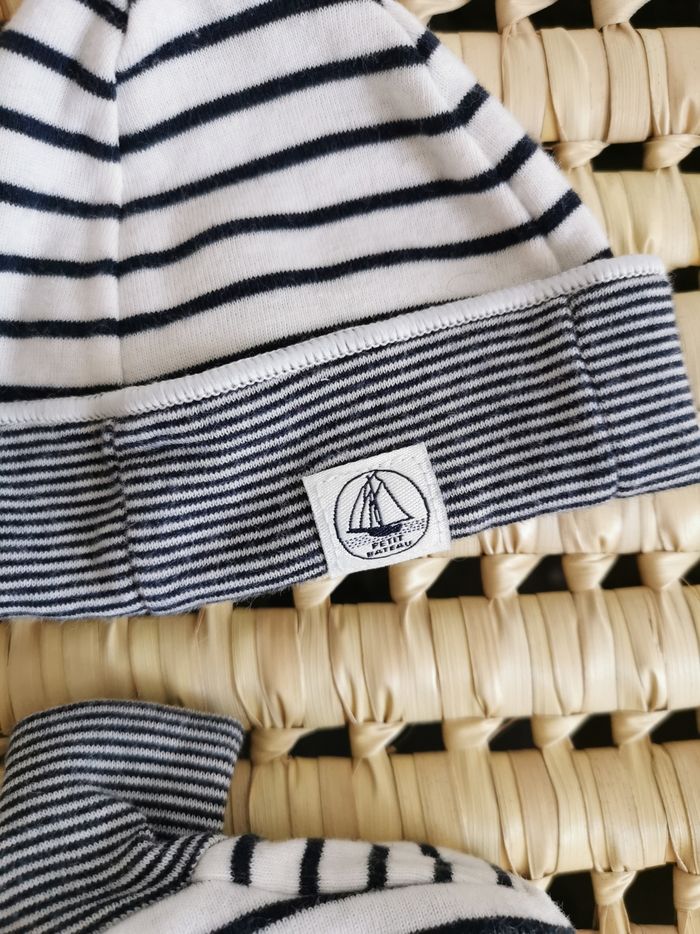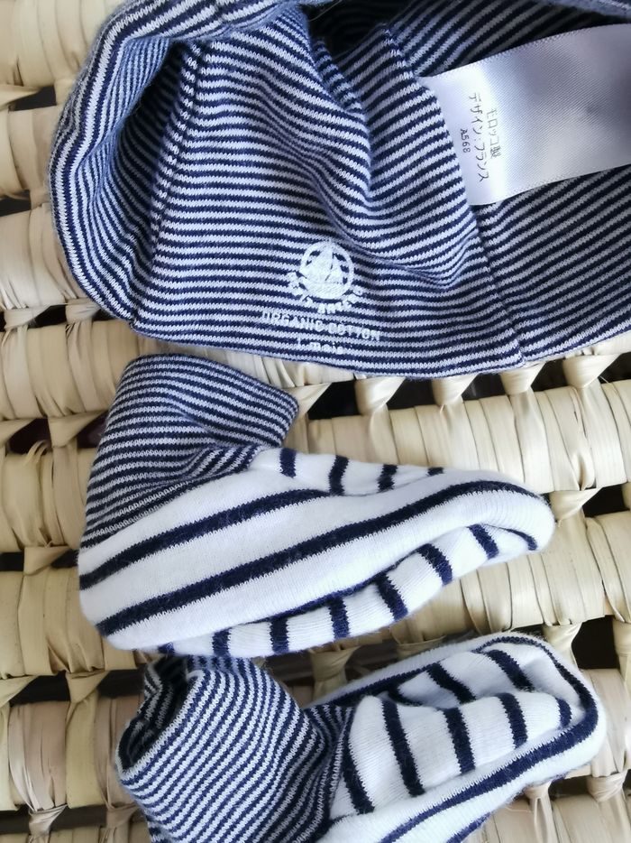 Cadeau de naissance idéal ! Bonnet naissance et chaussons en côte, la matière emblématique de Petit Bateau. Coton issu de l'agriculture biologique