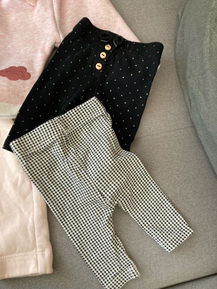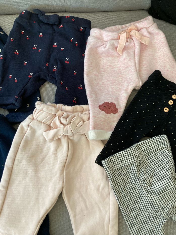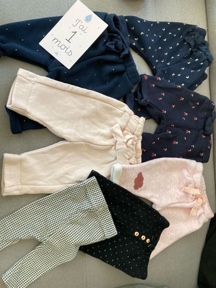 Vends lots de pantalon en parfait état - 5 pantalons molletonnés dont 4 de marque Kiabi seul le rose a la ceinture resserrée et de marque tape à l’œil - 2 leggings de marque Kiabi Taille 1 mois