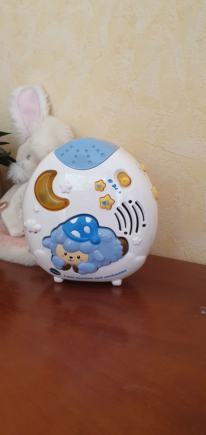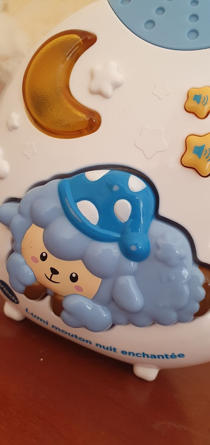 Vtech - Lumi mouton nuit enchantée bleu Une jolie veilleuse lumineuse et musicale pour aider Bébé à s’endormir ! La veilleuse Lumi mouton nuit enchantée accompagne tendrement Bébé dans son sommeil. Grâce à la projection lumineuse et aux différents sons de la nature et mélodies, Bébé est rassuré et s’endort paisiblement. Si Bébé se réveille et pleure pendant la nuit, la veilleuse se déclenche automatiquement pour l’aider à se rendormir. Usure liées à l'usage dans le temps.