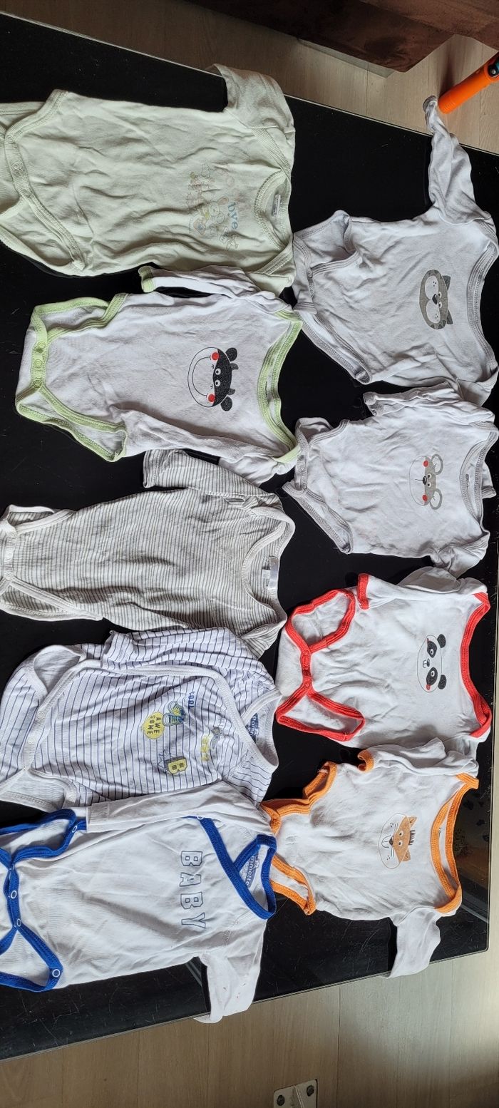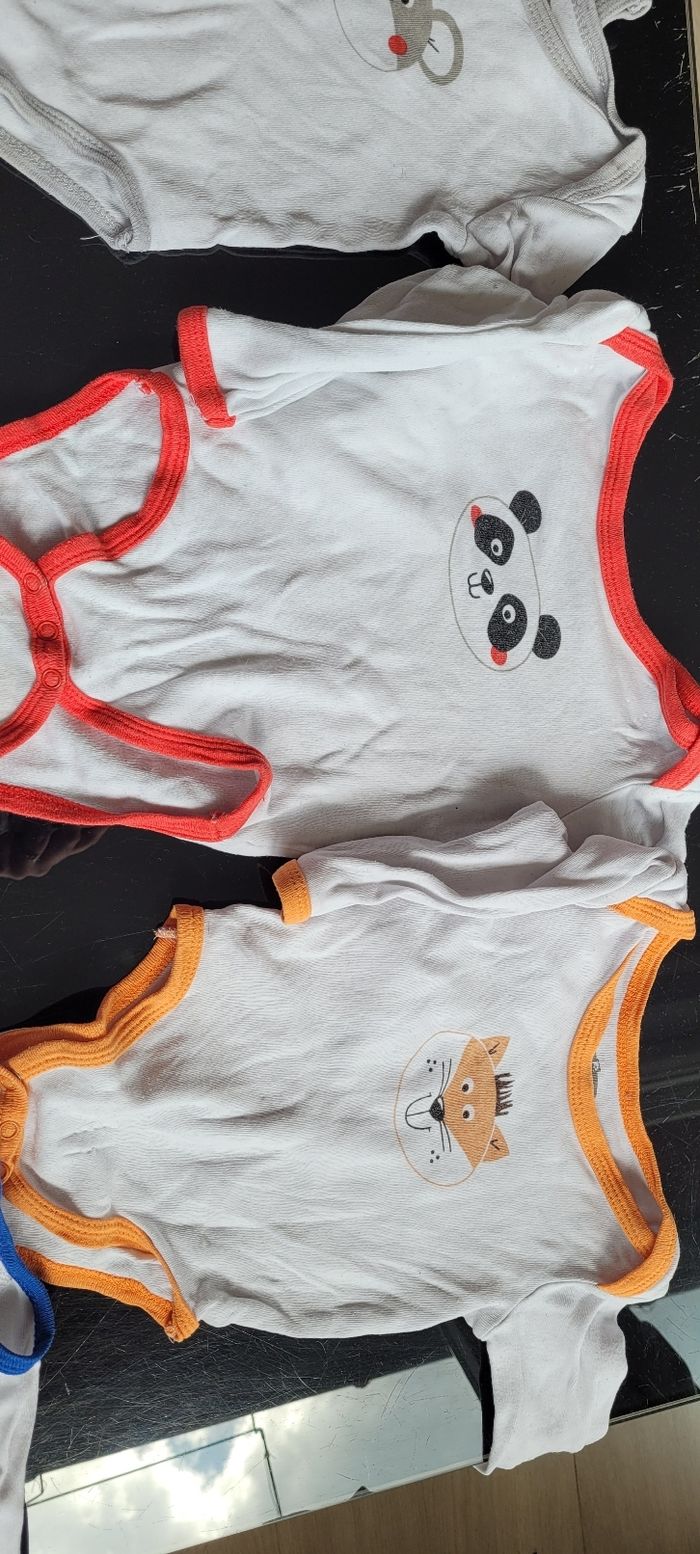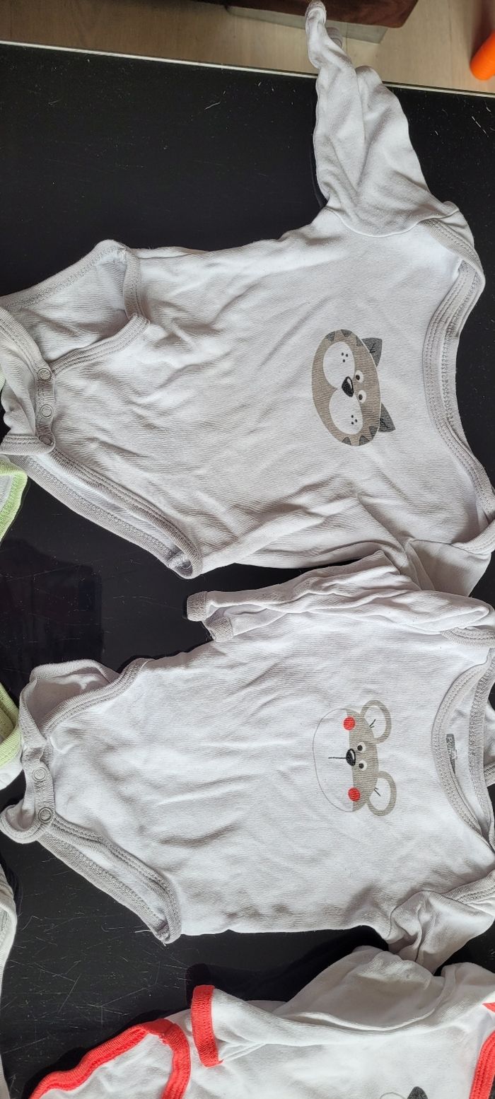 Lot de 5 bodies animaux marque pommette + 1 marque absorba + 1 kitchoun + 2 ouverture devant marque pommette. Soit 9 bodies Principalement garçon mais pouvant être mixte