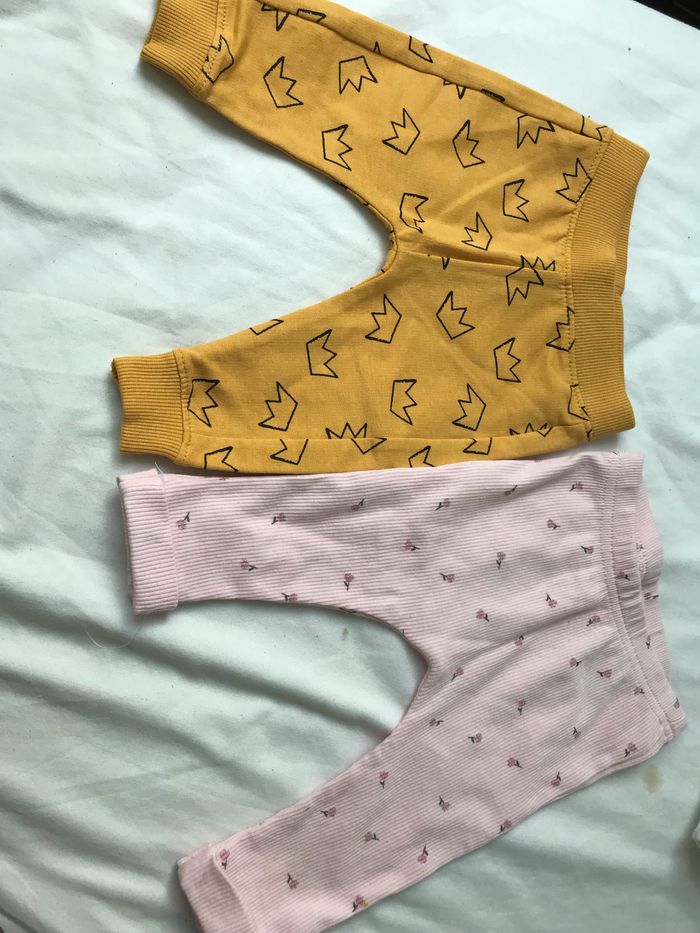 Deux pantalon pour bébé fille en très bon état Le jaune n'a jamais été porté et le rose a été porté deux fois Possibilité de venir récupérer