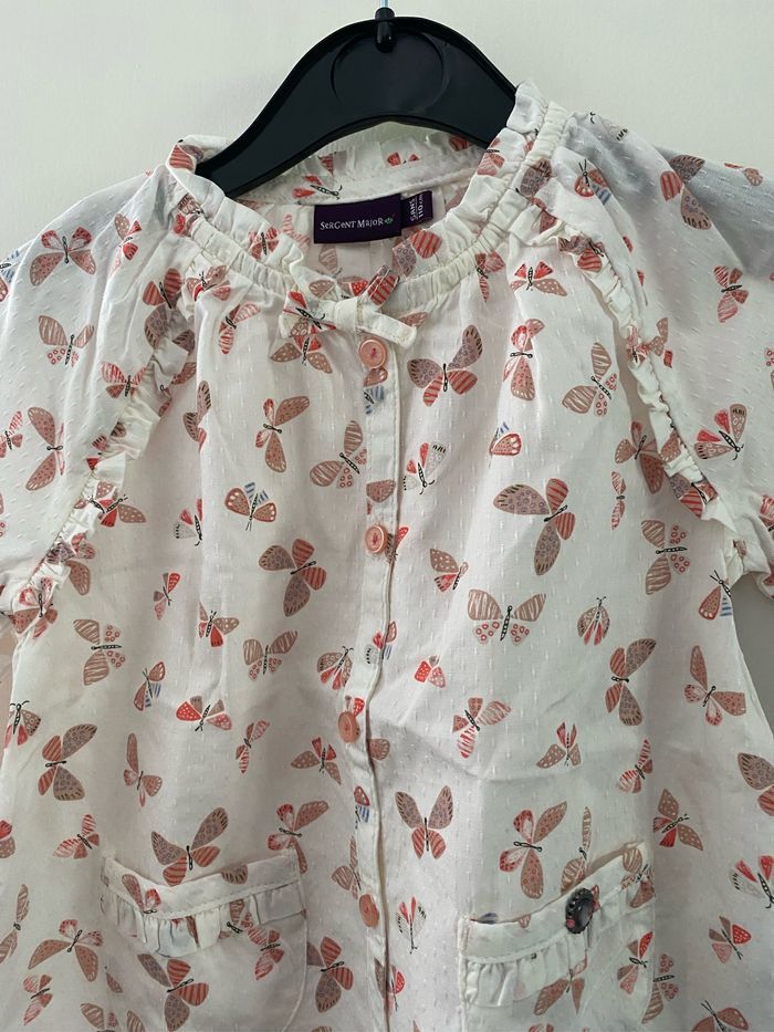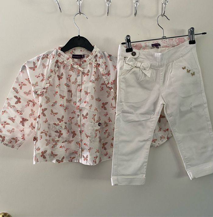 Ensemble fille Sergent Major – Taille 5 ans Joli ensemble composé d’un pantalon blanc et d’une blouse imprimée papillons, de la marque Sergent Major. 👗 Taille : 5 ans 📌 État : porté une seule fois lors d’un mariage – quasi neuf ✅ Détails pratiques : • Pantalon avec élastique réglable à la taille (boutons de serrage) • Blouse avec bouton de secours cousu à l’intérieur • Tissu de qualité, confortable et élégant Idéal pour une cérémonie, une fête ou même pour le quotidien chic ✨