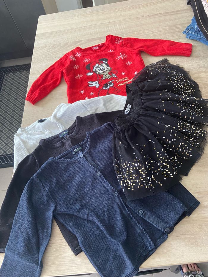 3 gilet 12 mois (bleu marine , blanc et noir ) Une jupe en tulle à paillette noir et doré 12 mois Un pull rouge minnie 12 mois Le tout en très bon état