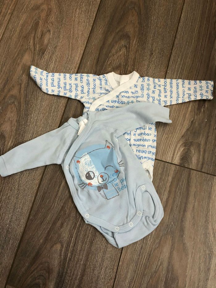 Lots de deux bodies naissance manches longues, neuf jamais porté car mon fils était trop grand à la naissance. N’hésitez pas à faire des lots, je peux faire des réductions importantes.