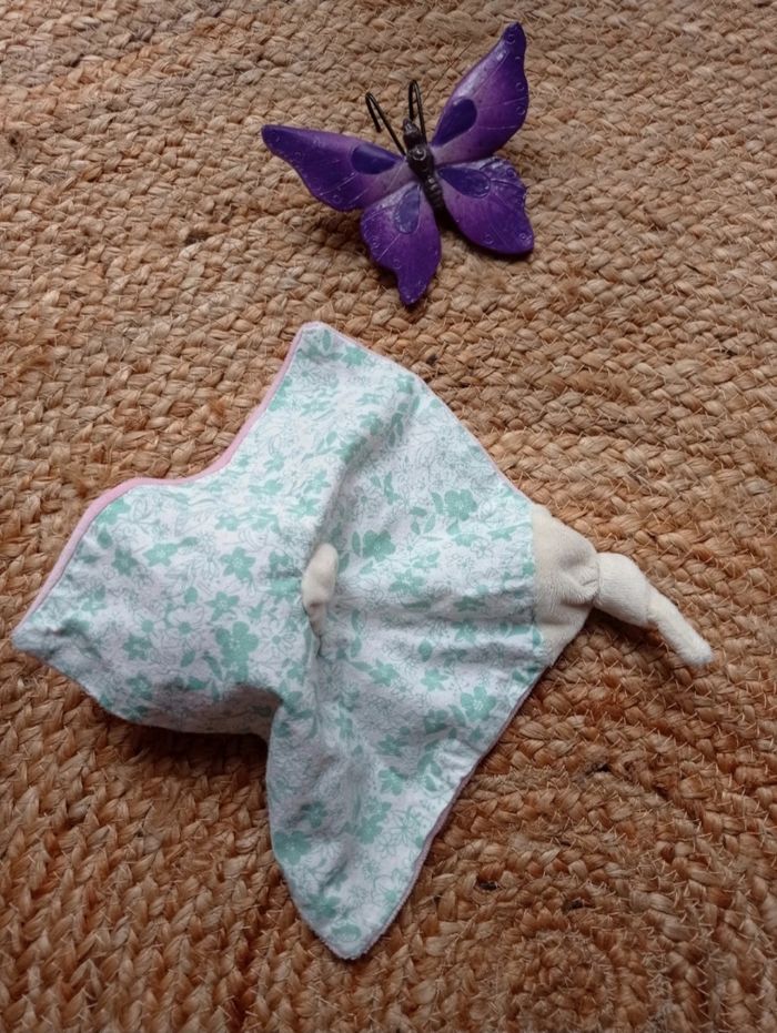 Tex Baby carrefour Doudou semi plat Souris Rose vert Broderie fleur Étiquette de composition absente #douceur_texbaby C7