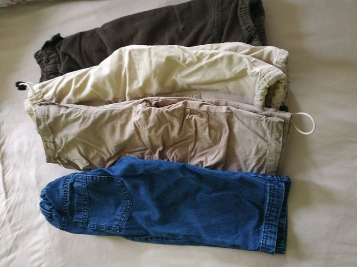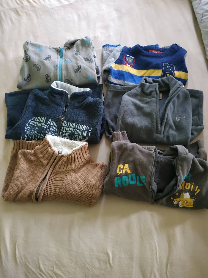 Lot comprenant 9 pantalons 6 sweats et gilets 6 t-shirts manches longues 1 polo manches courtes 1 gilet sans manches Différentes marques : Okaïdi, in extenso, Kiabi, Gémo, la halle... Très bon état