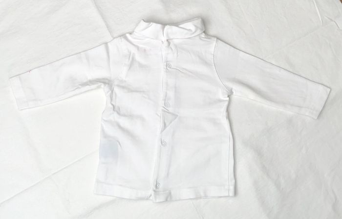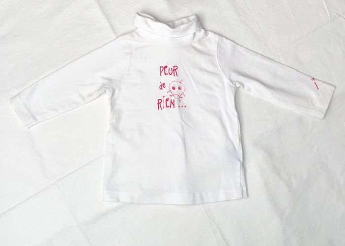 T-shirt, sous pull Kimbaloo Taille 6mois/67 cm Manches longues. Col montant/roulé Coton/élasthanne : tissu très doux. De couleur uni blanc avec la phrase : « peur de rien » pour les bébés intrépides ;) Ouverture par pressions tout le long du dos. En excellent état, aucune imperfection. Comme neuf.