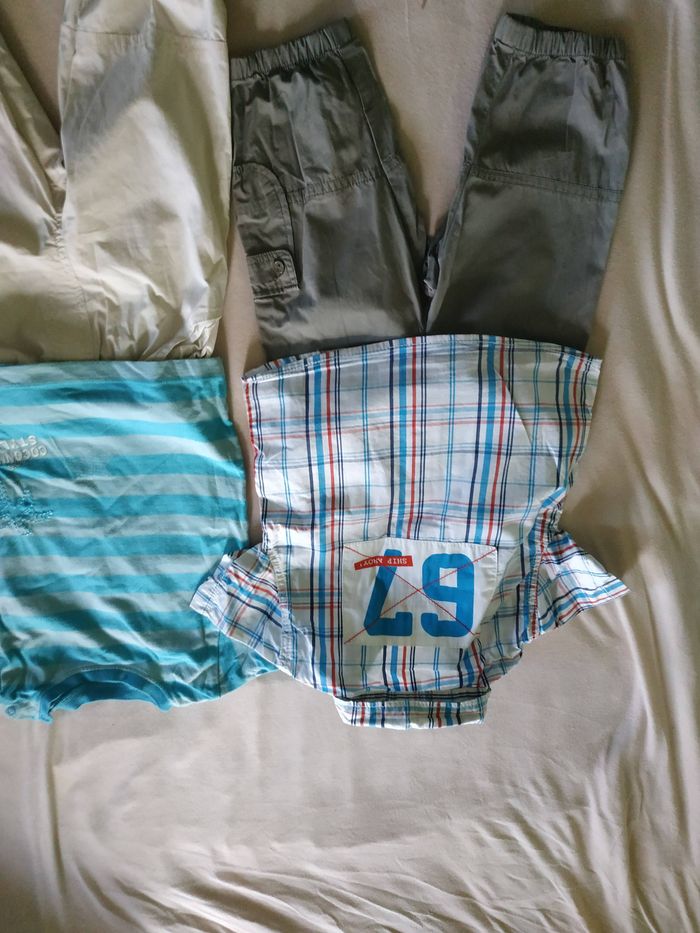 2 pantalons légers taille élastique Une chemise Un t-shirt 18 mois mais taille petit Très bon état