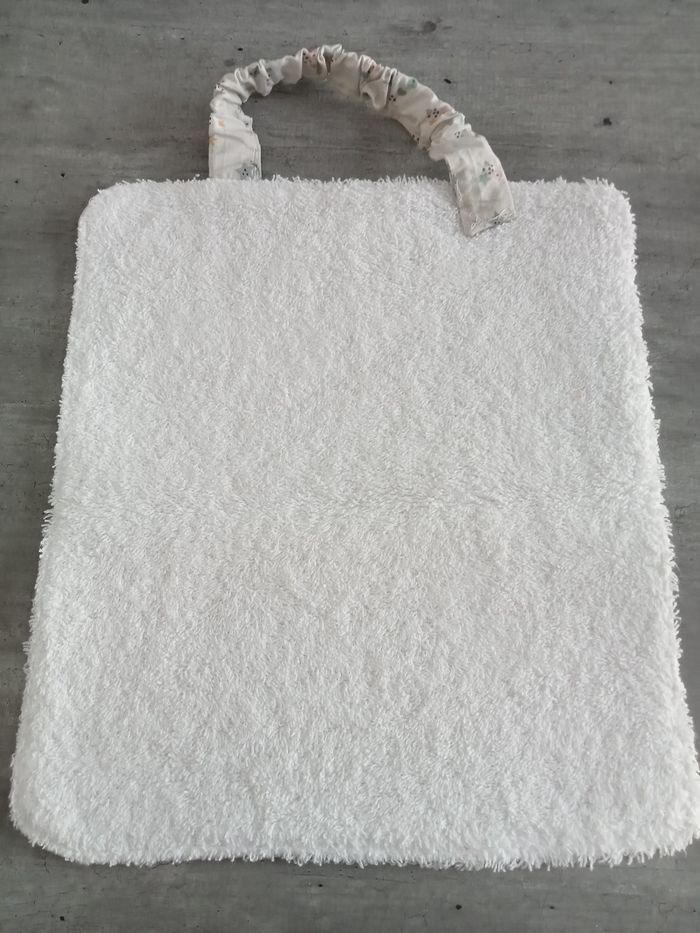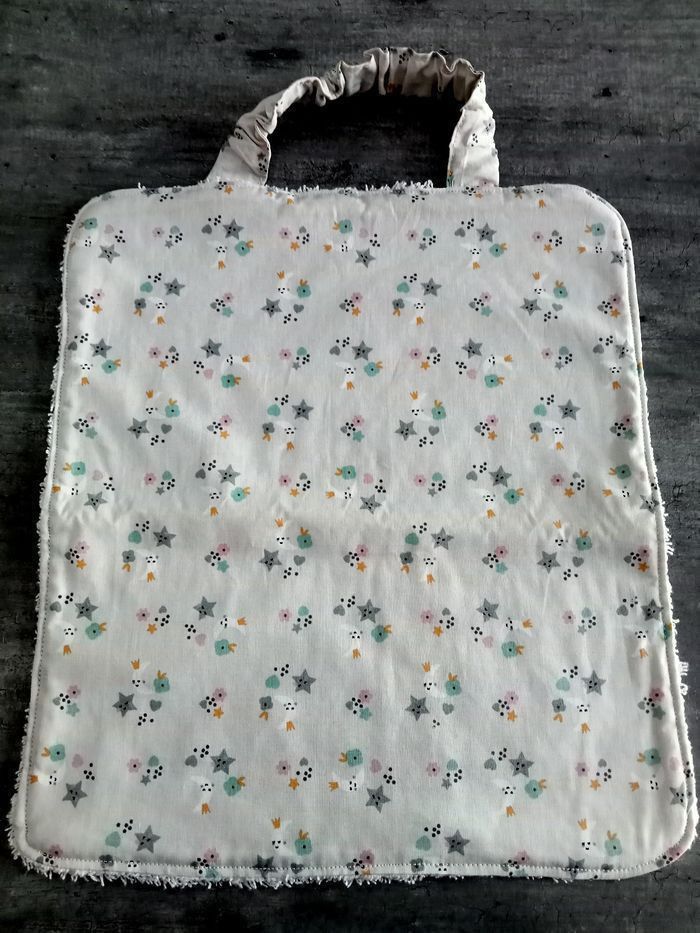Grand bavoir Hauteur 32 cm Largeur 29 cm 1 face tissu fantaisie 1 face tissu éponge Fermeture par pression et élastique Tissu certifié oeko Tex Lavable à 30°